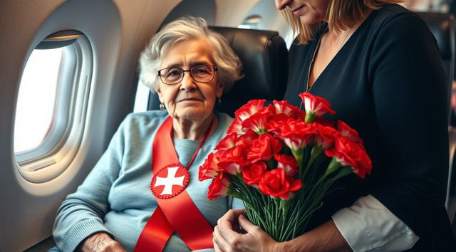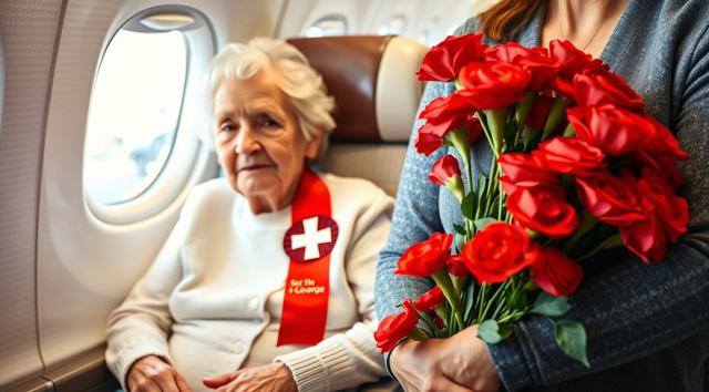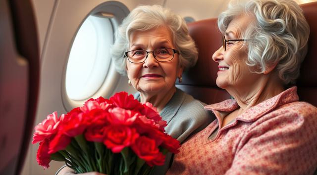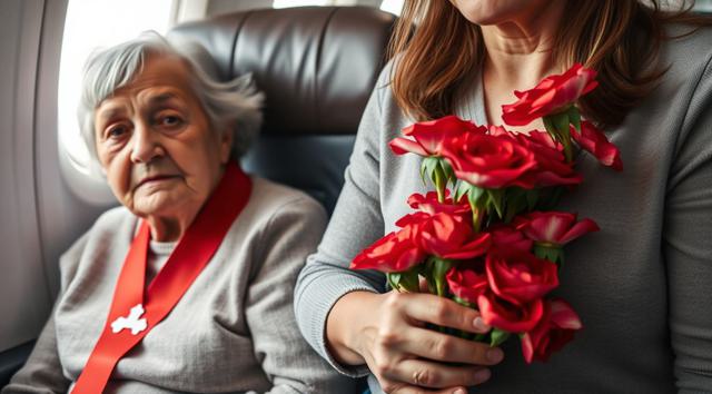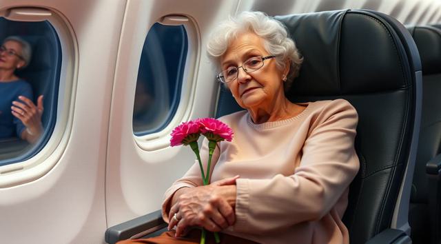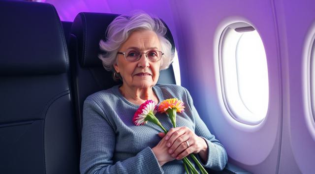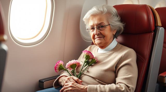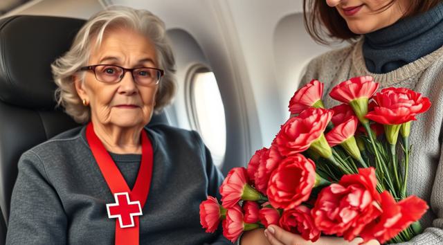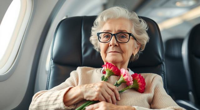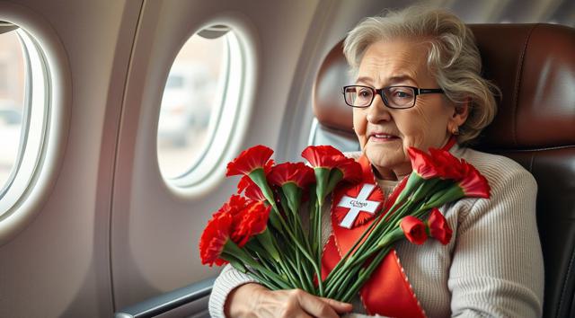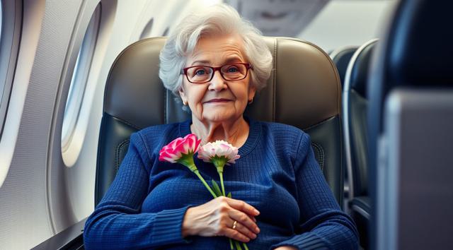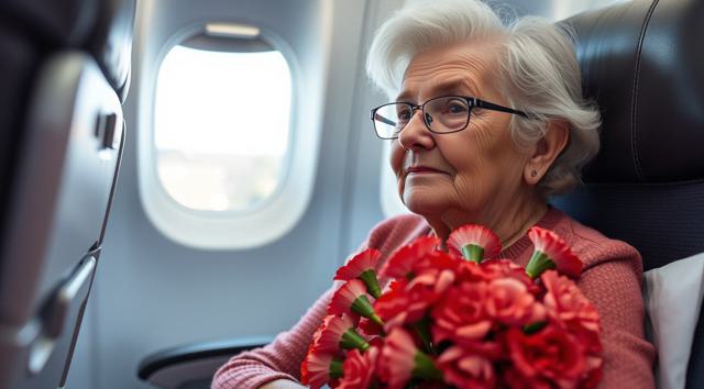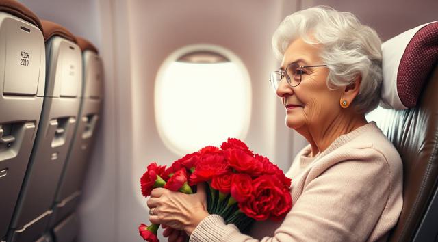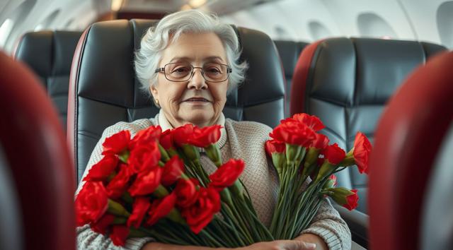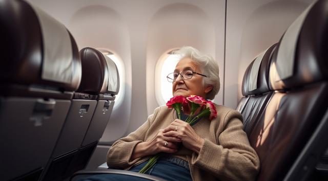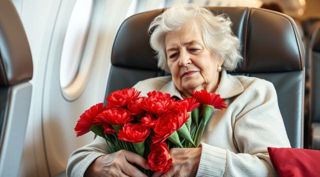 пожилая женщина сидит в кресле самолета, на руках держит будет гвоздик, реалистичное фото