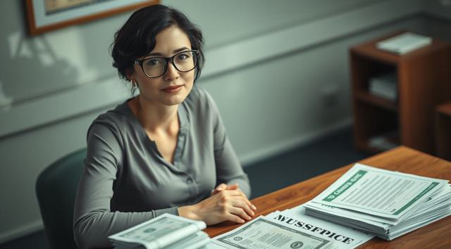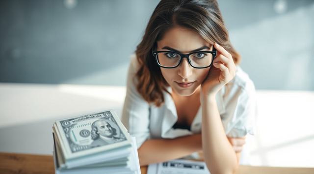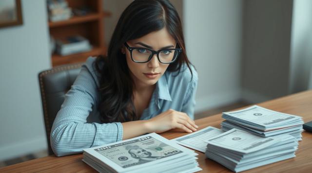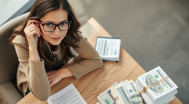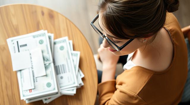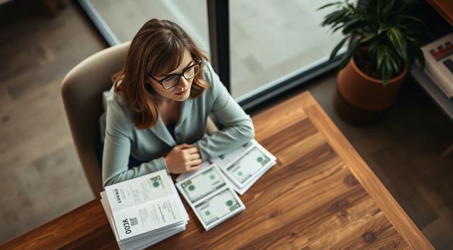 женщина в очках для зрения, которая сидит за столом, на столе стопка бумаг и деньги, вид на стол сверху