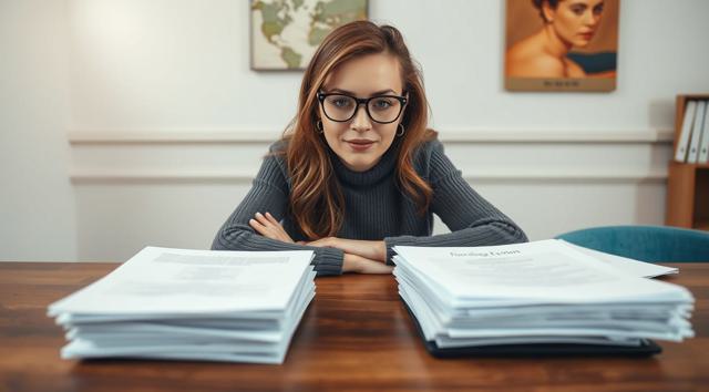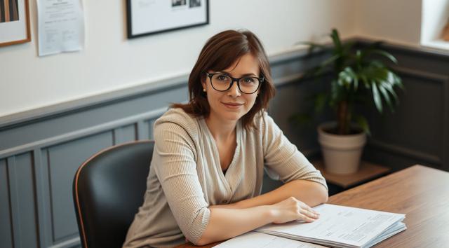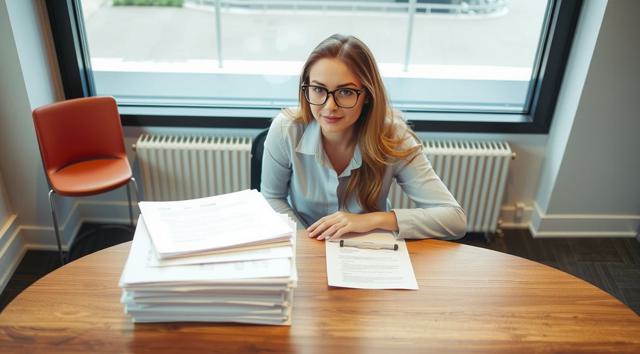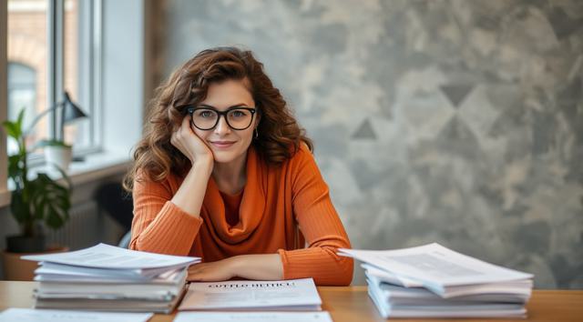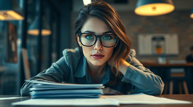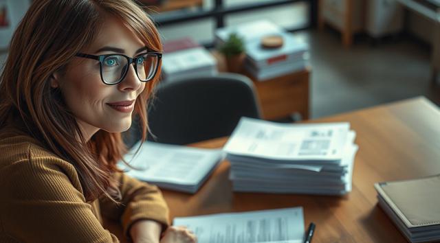 женщина в очках для зрения, которая сидит за столом, на столе стопка бумаг, вид на стол сверху