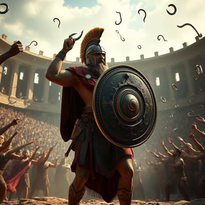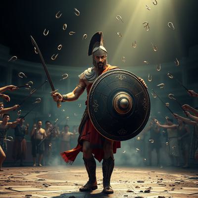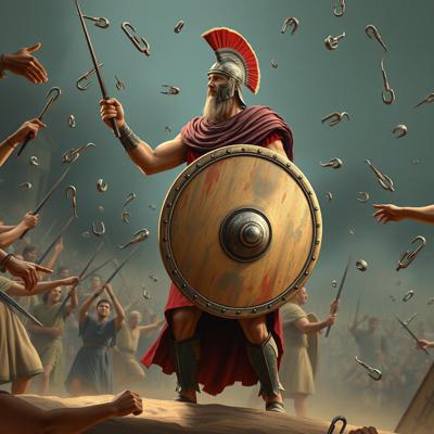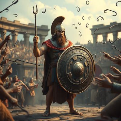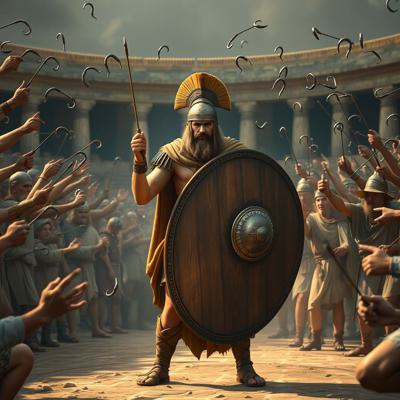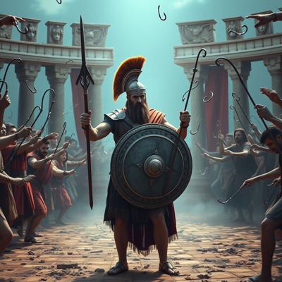 На арене стоит греческий воин, в обоих руках держит щит. Вокруг него люди бросают в воина рыболлвецкие крючки