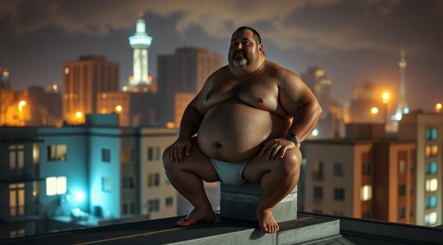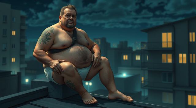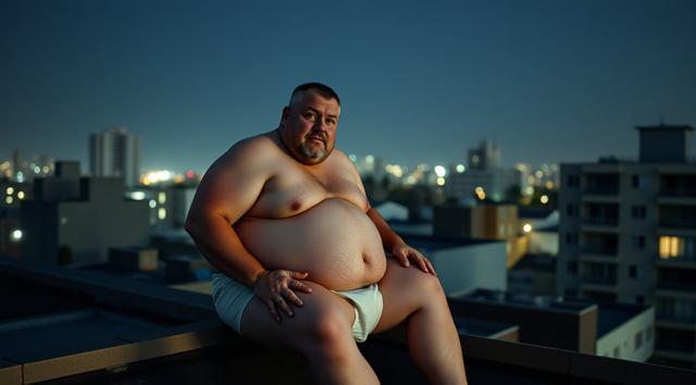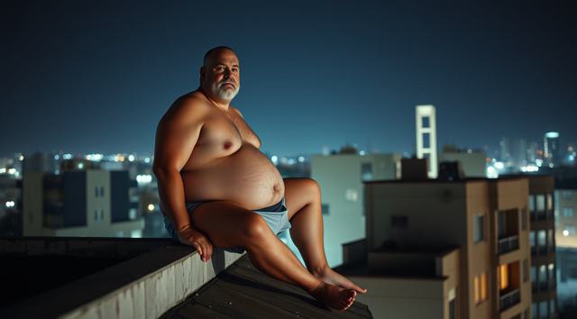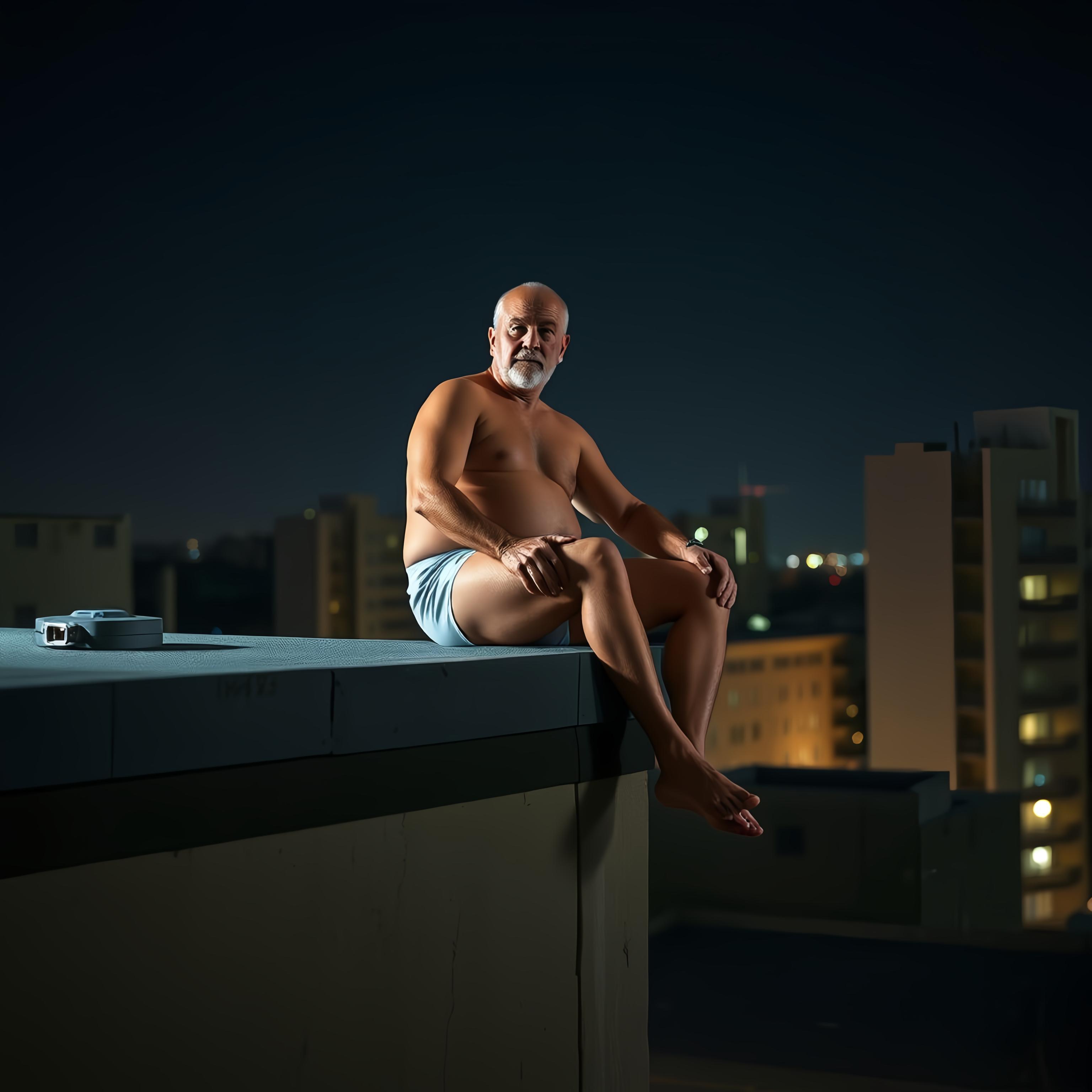 упитанный мужчина 45 лет в одних трусах сидит на крыше здания. ночь