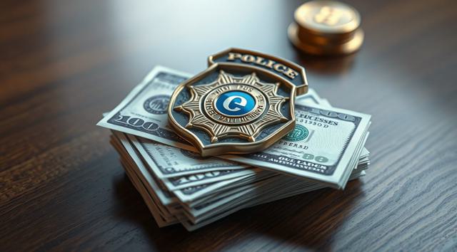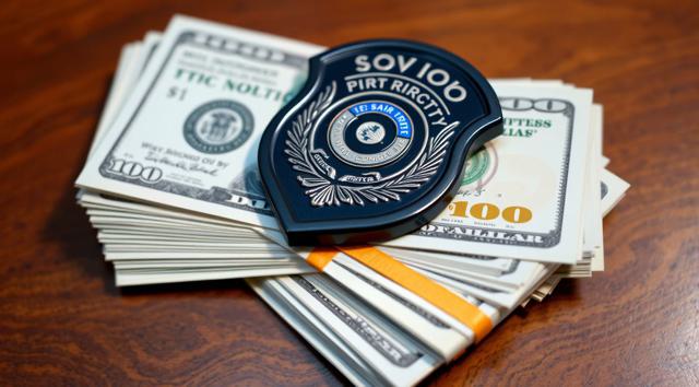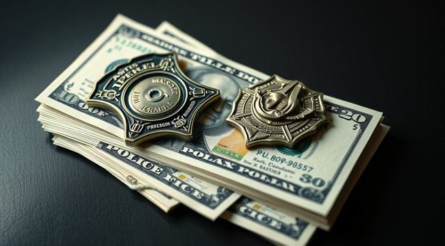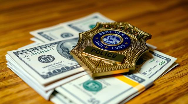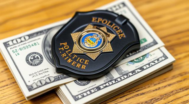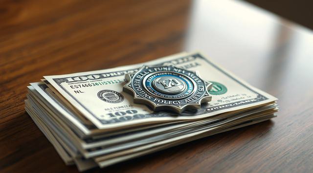 пачка долларов на столе, сверху на ней лежит полицейский жетон