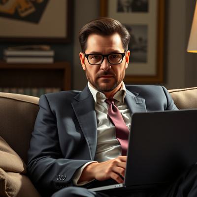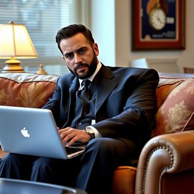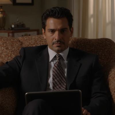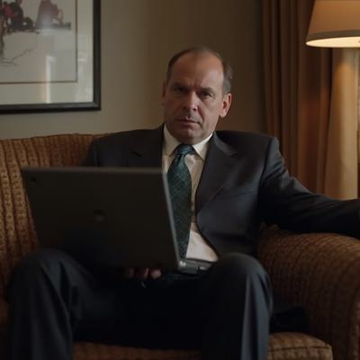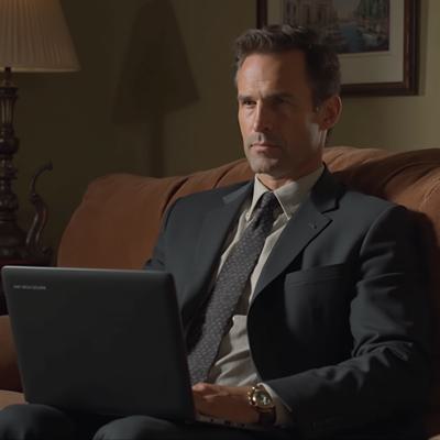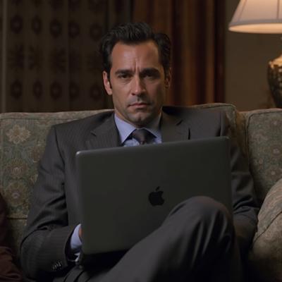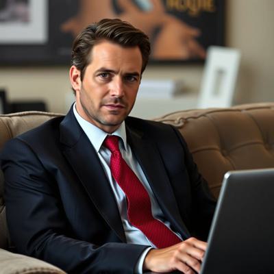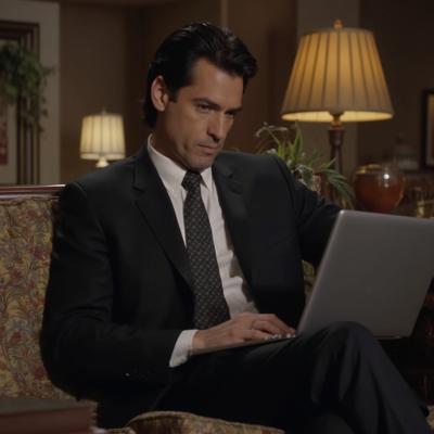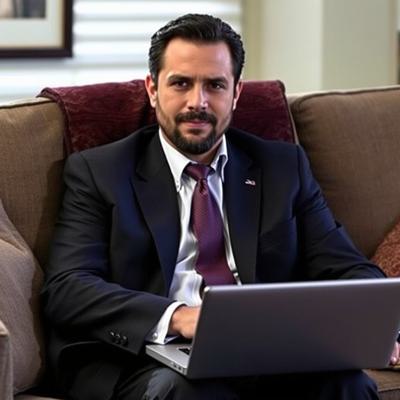 Greg Ellis в роли Майкла Амадора из сериала 24 часа, в костюме сидит на диване с ноутбуком. Оригинальное лицо, сходство 100%
