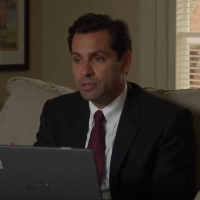 Greg Ellis in a gray suit, tie, short haircut, dark hair, sitting on the couch with a tablet