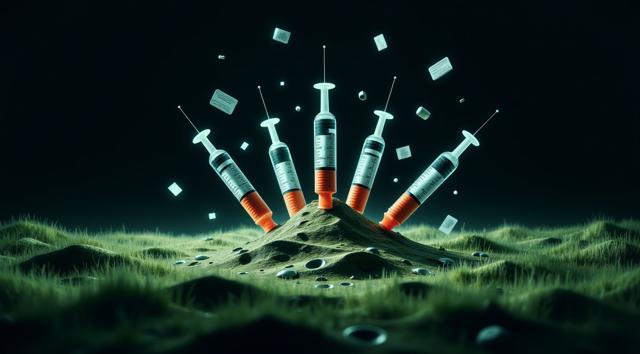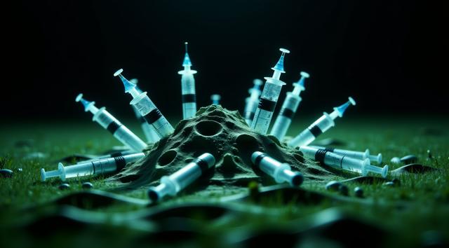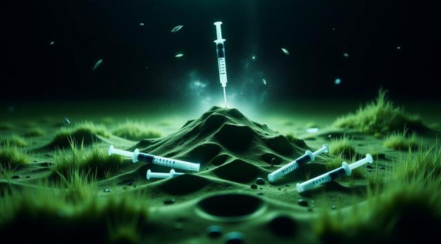 Обои в нарко тематике, темный фон, зеленая травка, шприцы, горка порошка, высокое качество, карточки, все это раскидано по фону, рисовка,