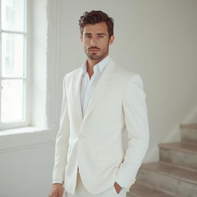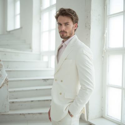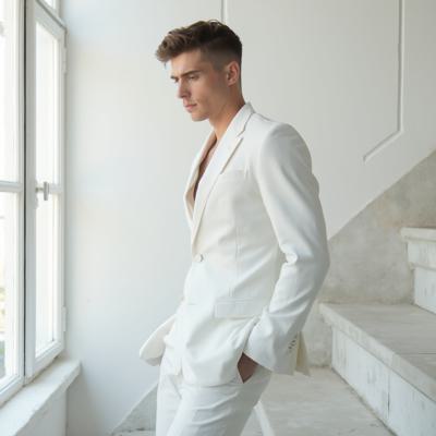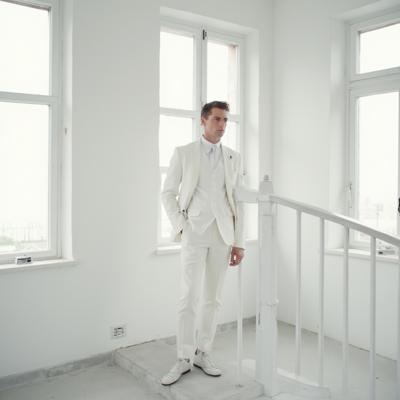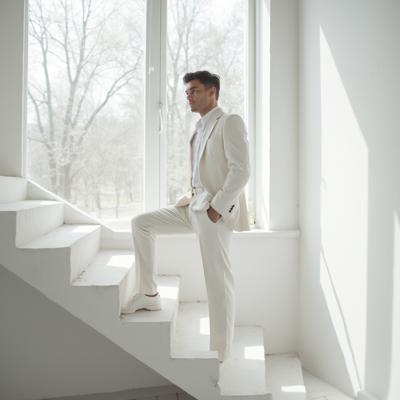 Молодой мужчина 23 лет славянин одет в белый костюм у окон около лестницы на белом фоне, модель, позирует