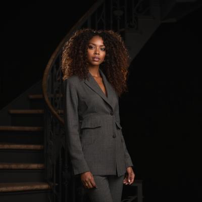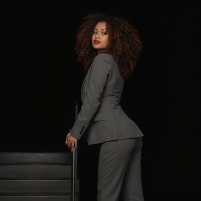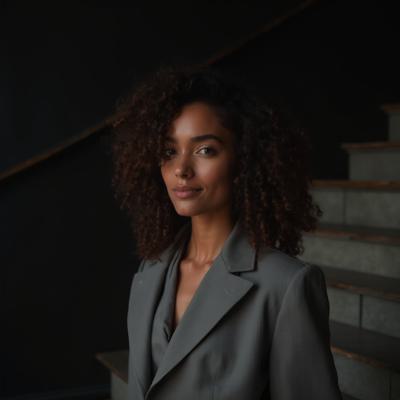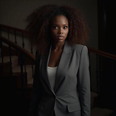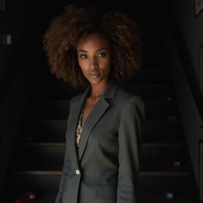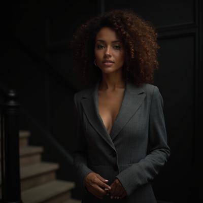 Темнокожая женщина шатенка с кудрявыми объёмным волосами в сером костюме на чёрном фоне около лестницы