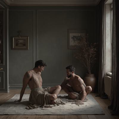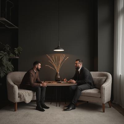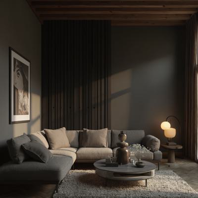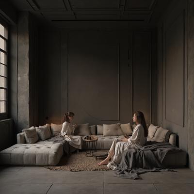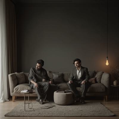 Мужчины и женщины в нейтральных комнатах в тёмных тонах