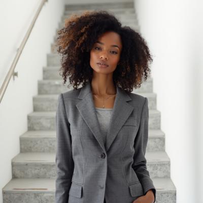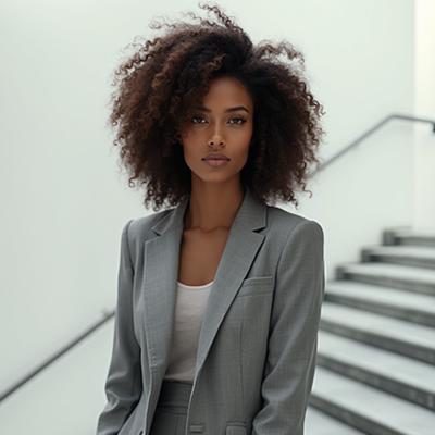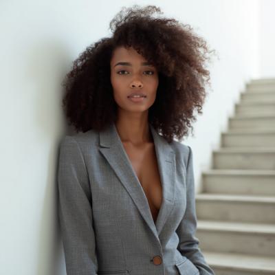 Темнокожая женщина шатенка с кудрявыми объёмным волосами в сером костюме на белом фоне около лестницы