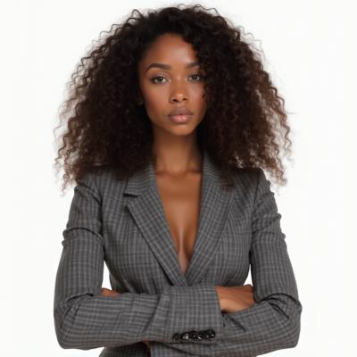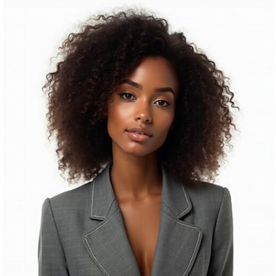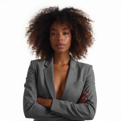 Темнокожая женщина шатенка с кудрявыми объёмным волосами в сером костюме на белом фоне