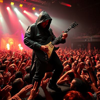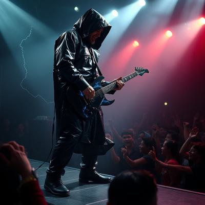 в полный рост. мужчина в черном плаще с электрогитарой играет метал на сцене в закрытом помещении перед плотной толпой