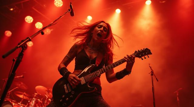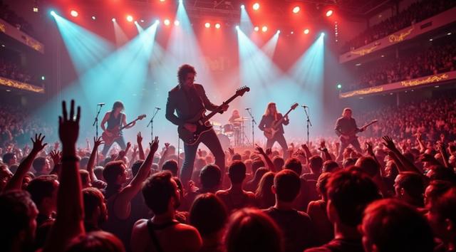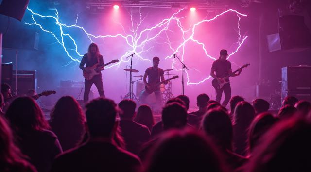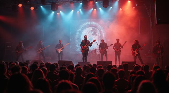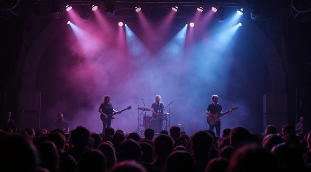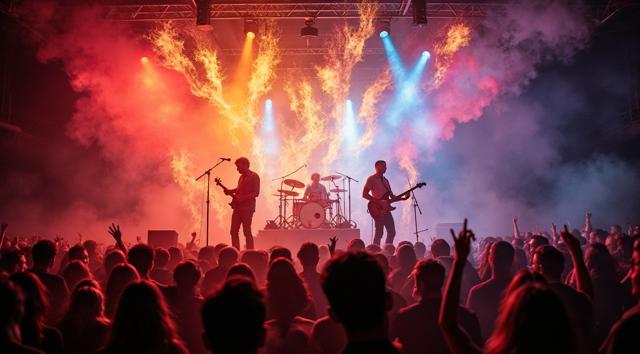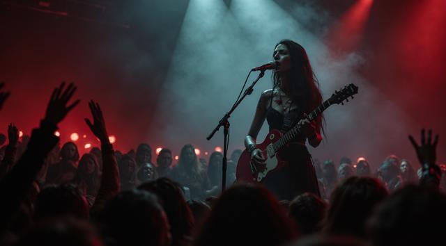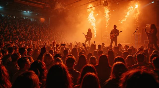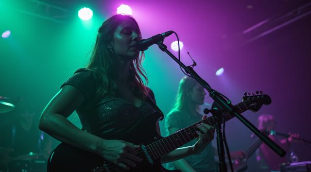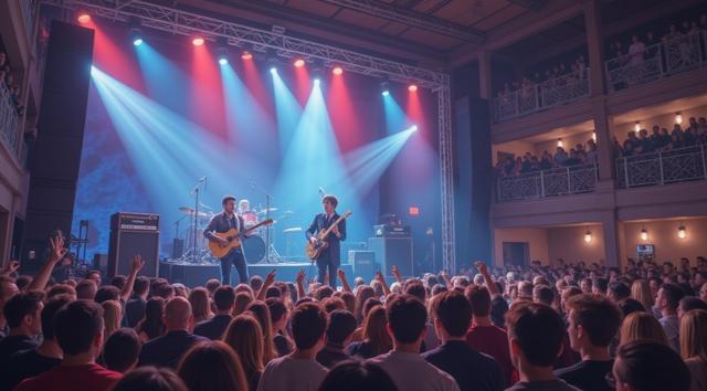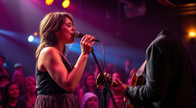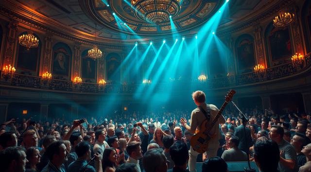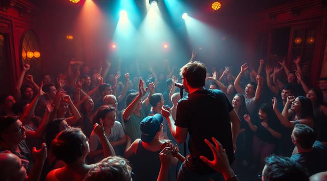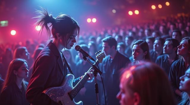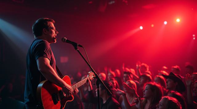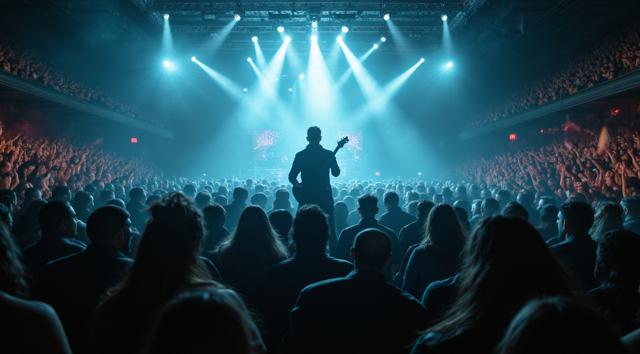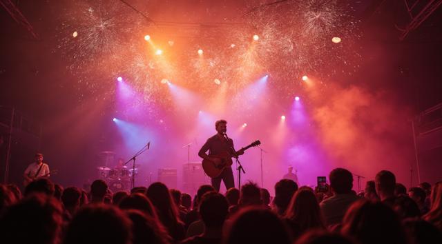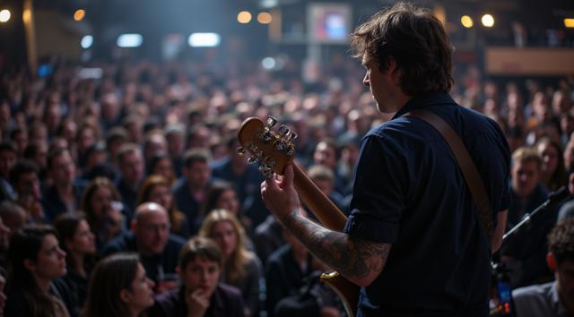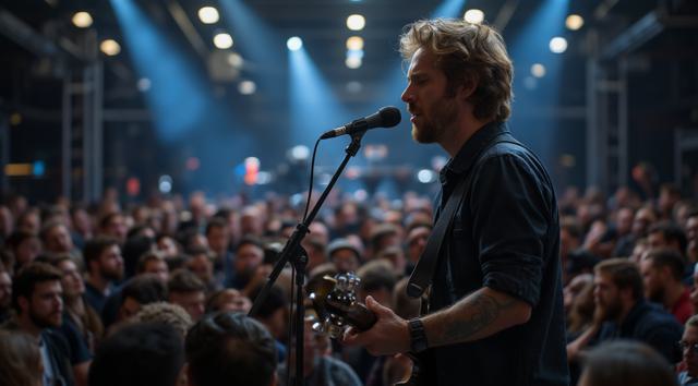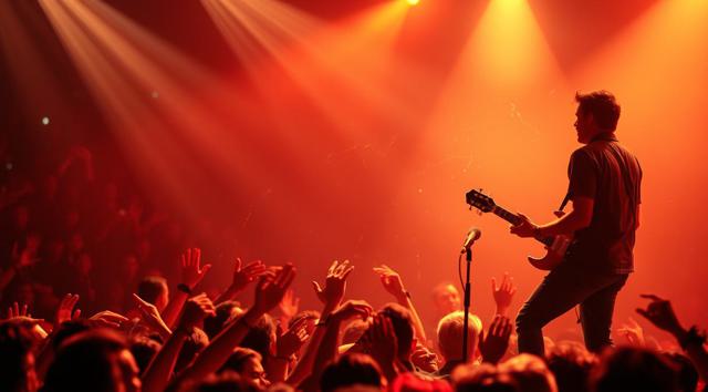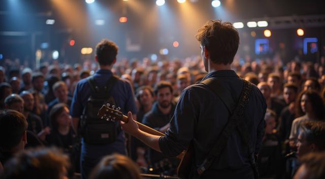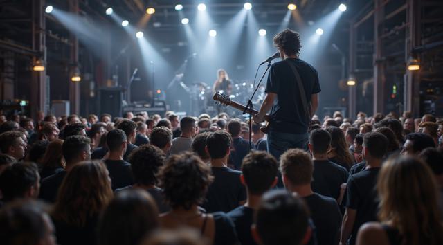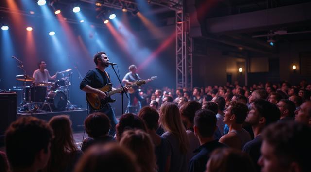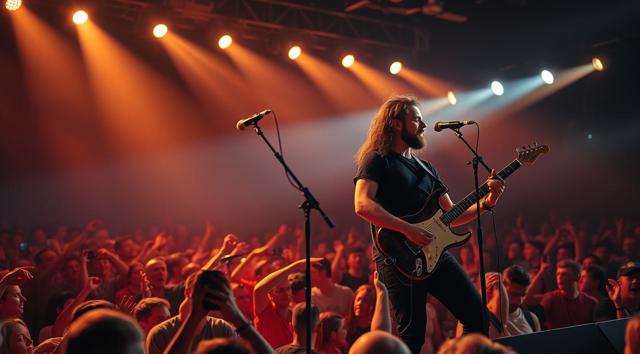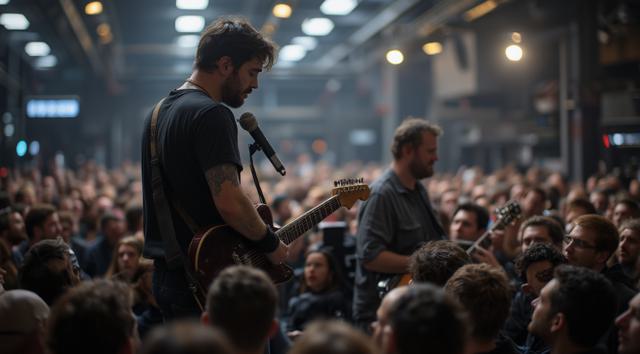вокалист и гитарист выступают на сцене в закрытом помещении перед плотной толпой