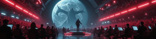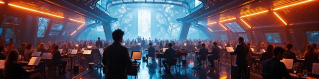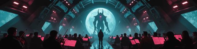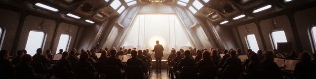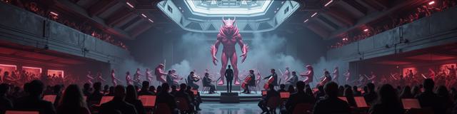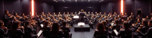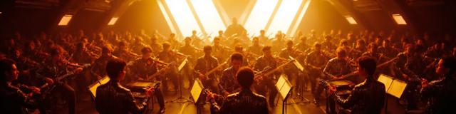 академический симфонический оркестр исполняет современную музыку внутри футуристичного космического корабля [Улучшение лиц + качество x2 ]