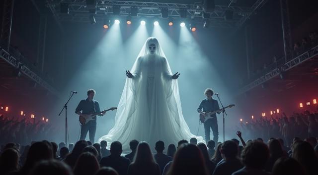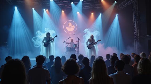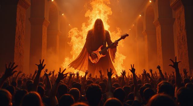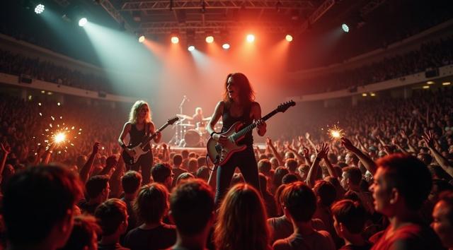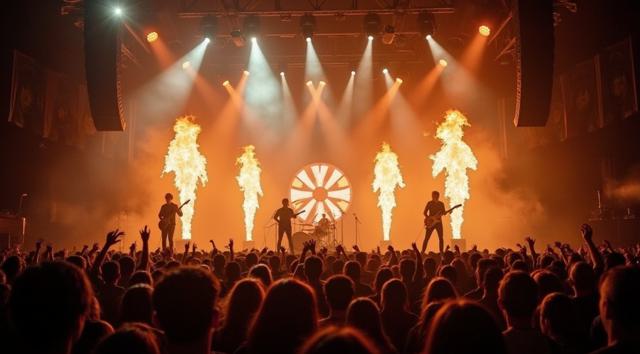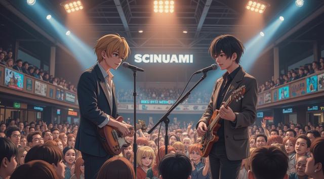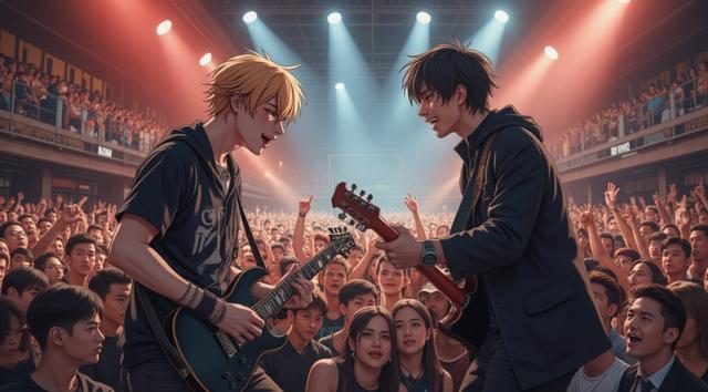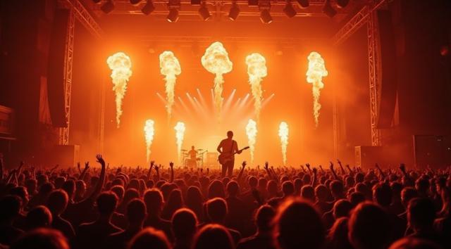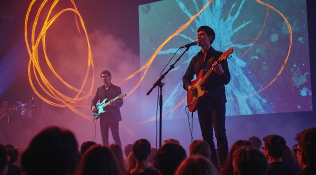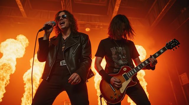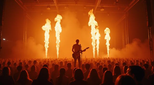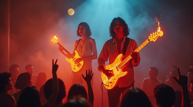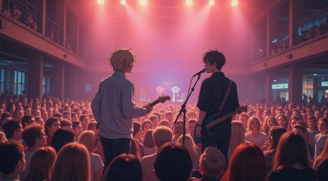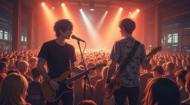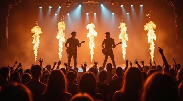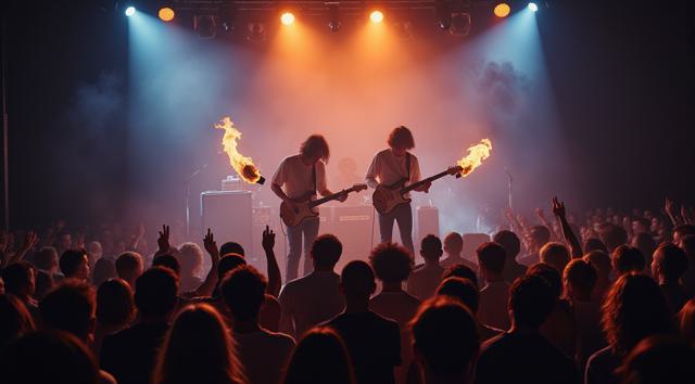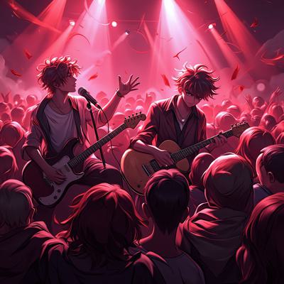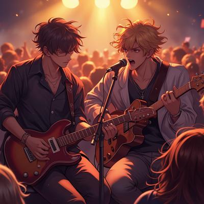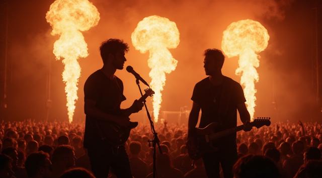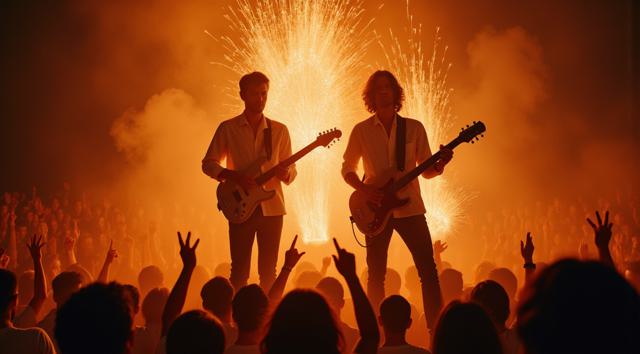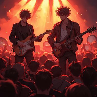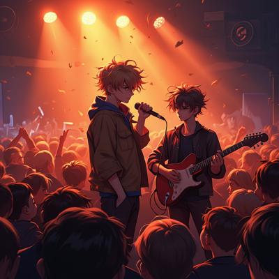 мужской дуэт, вокалист и гитарист, выступают на сцене в закрытом помещении перед плотной толпой. Яркое освещение и файер-шоу.
