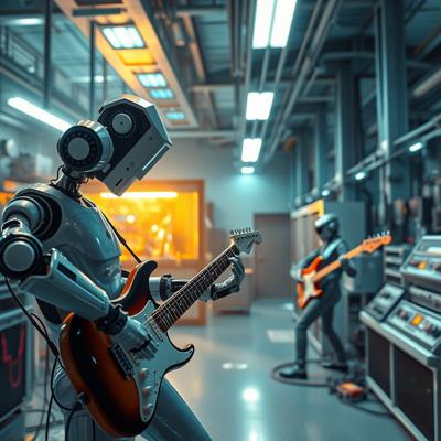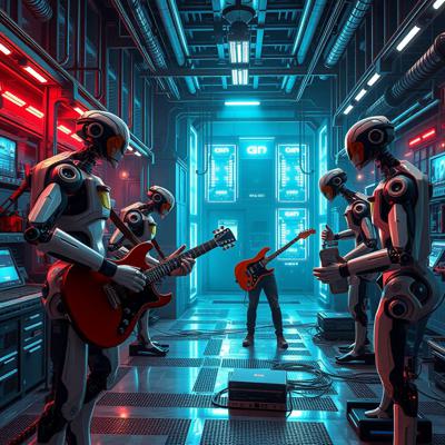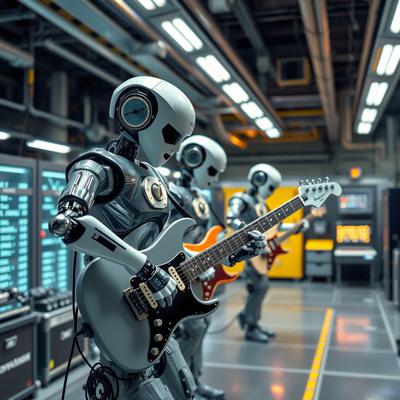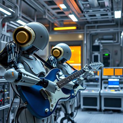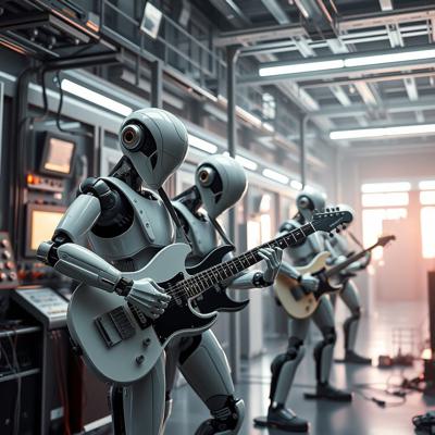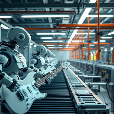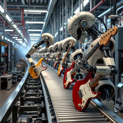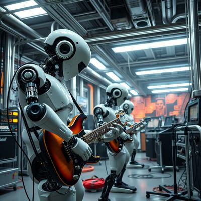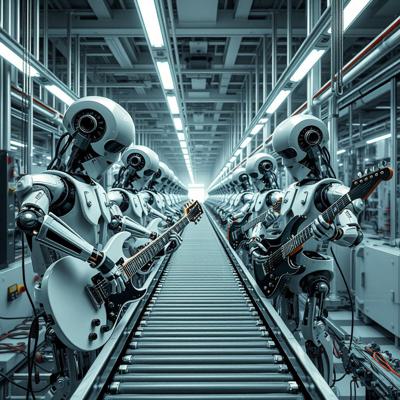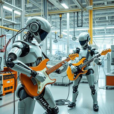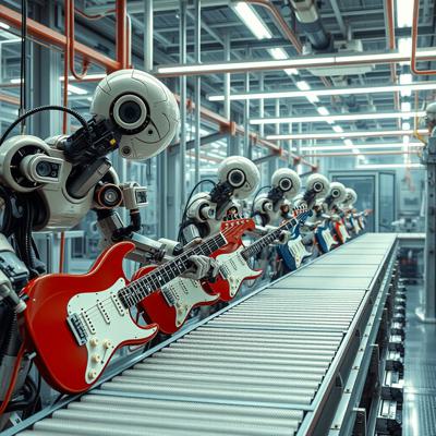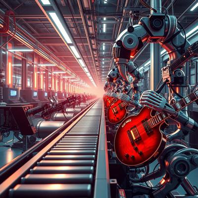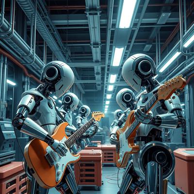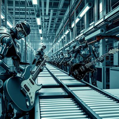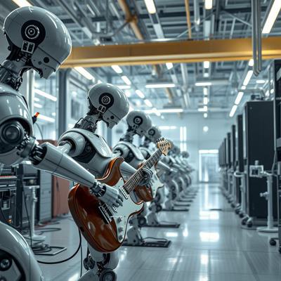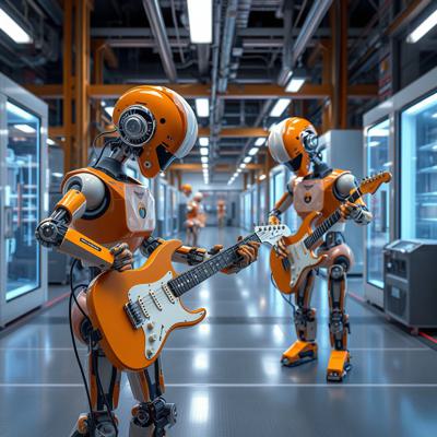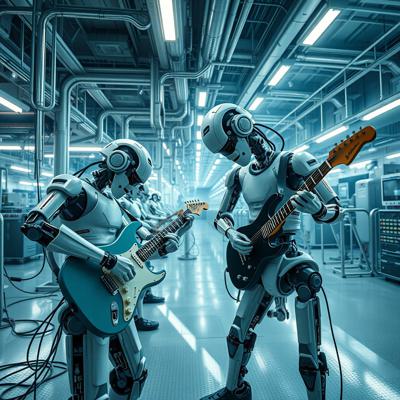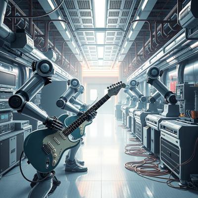 футуристичный высокотехнологичный производственный цех, но механические манипуляторы играют на электрогитарах