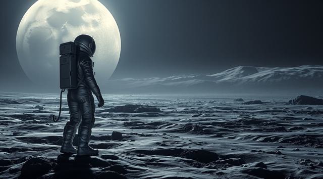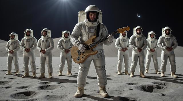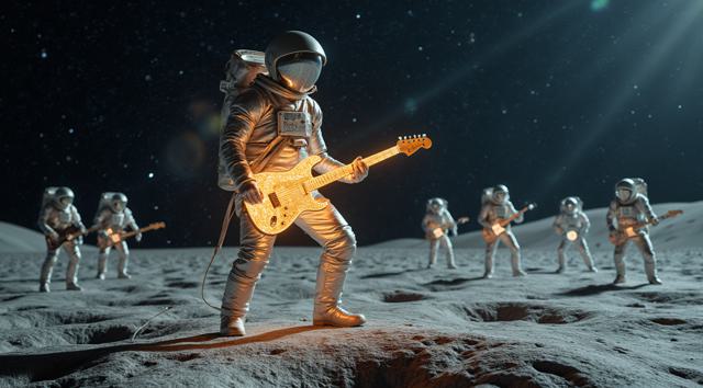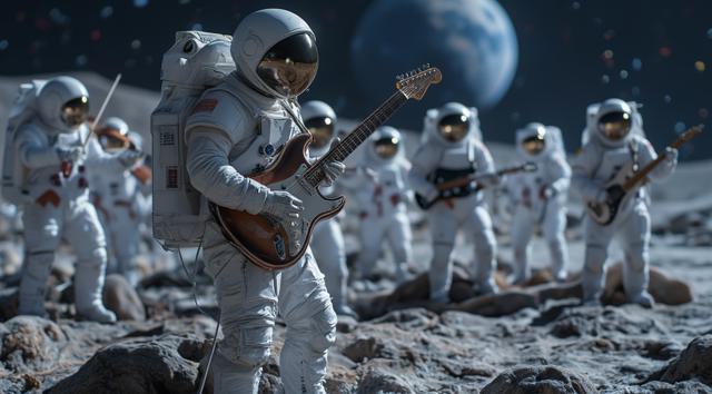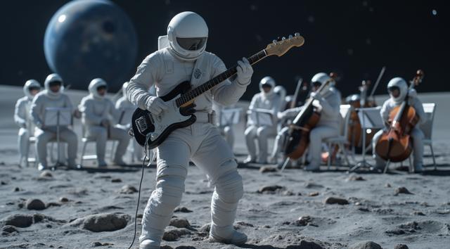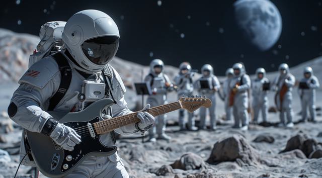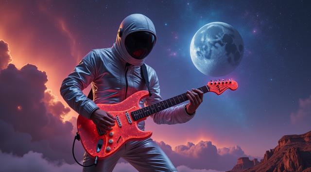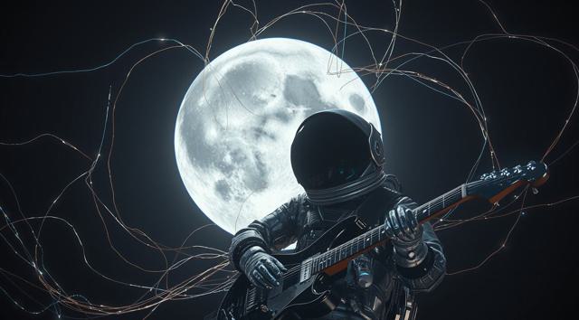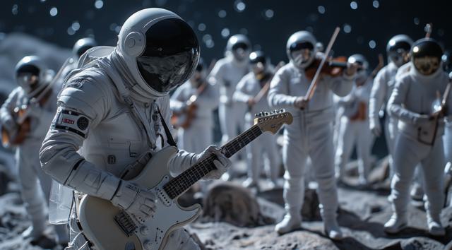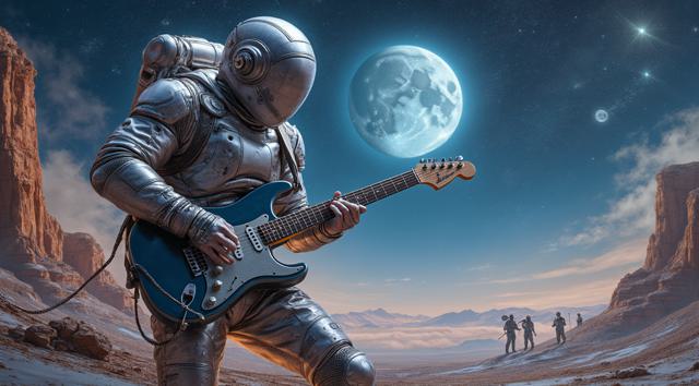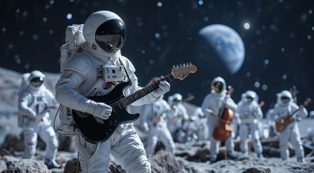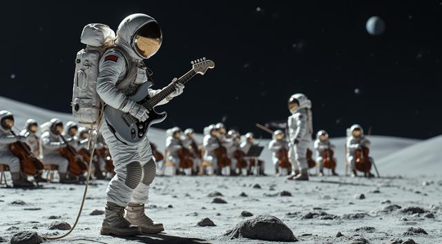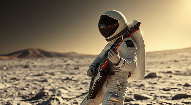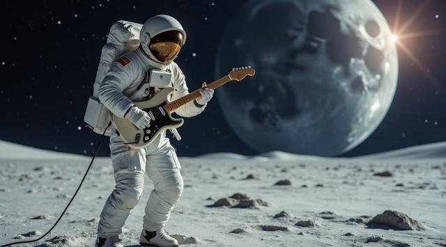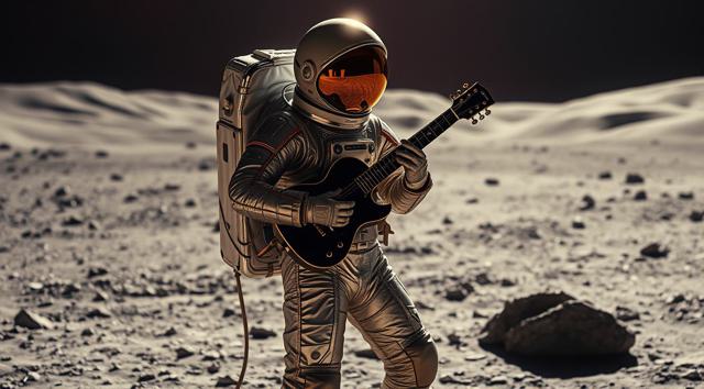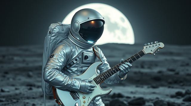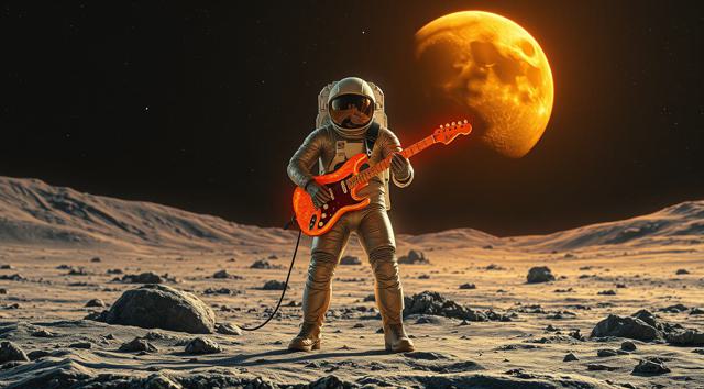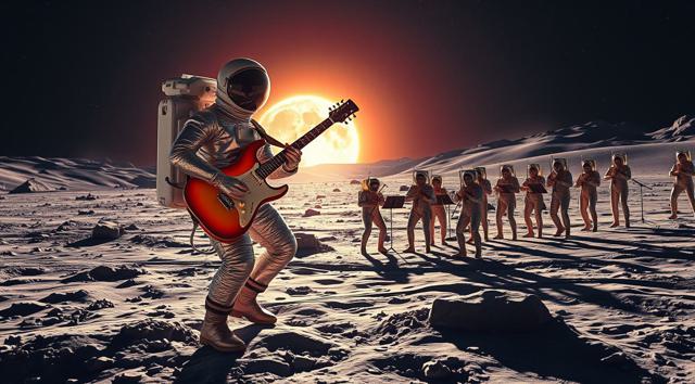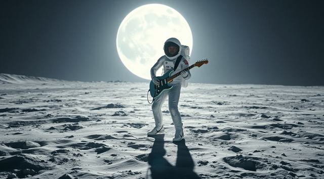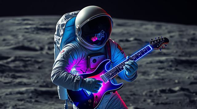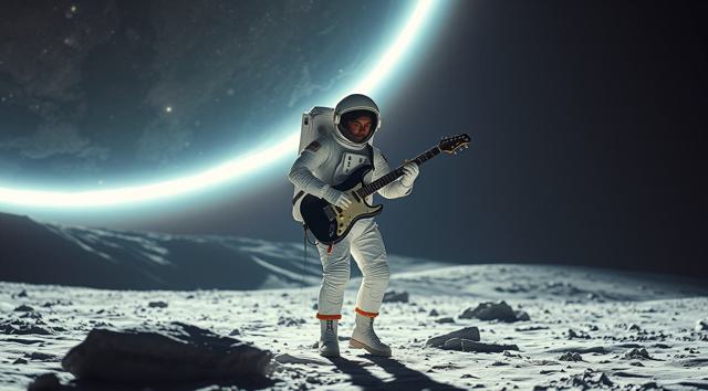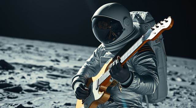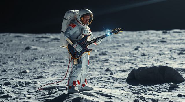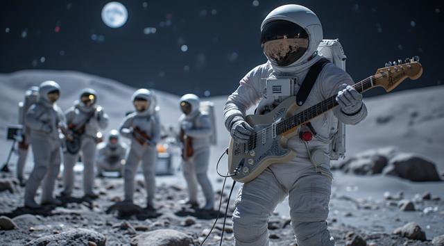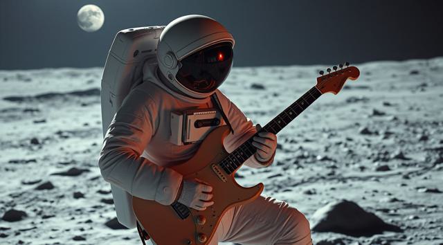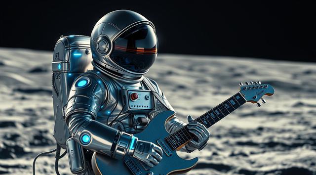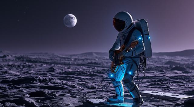 музыкант в футуристичном скафандре играет на электрогитаре стоя на поверхности Луны