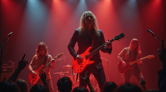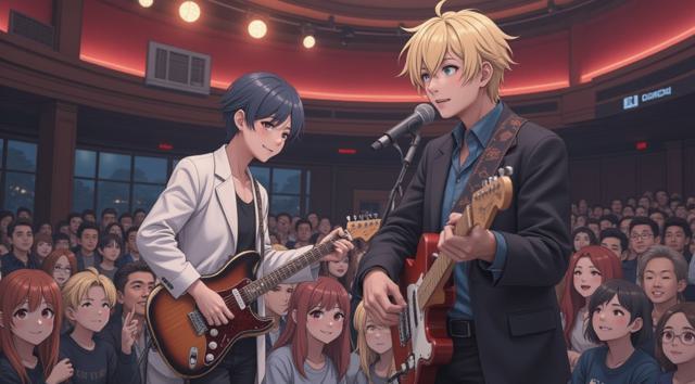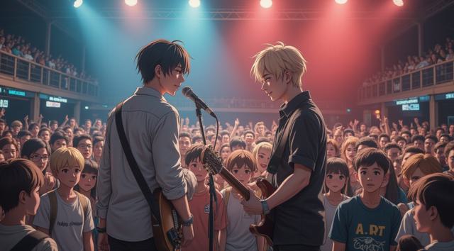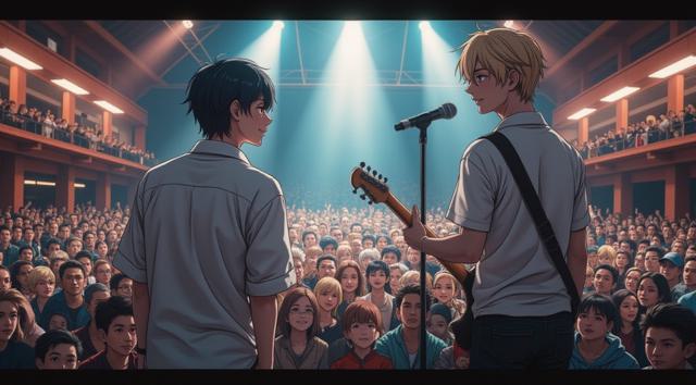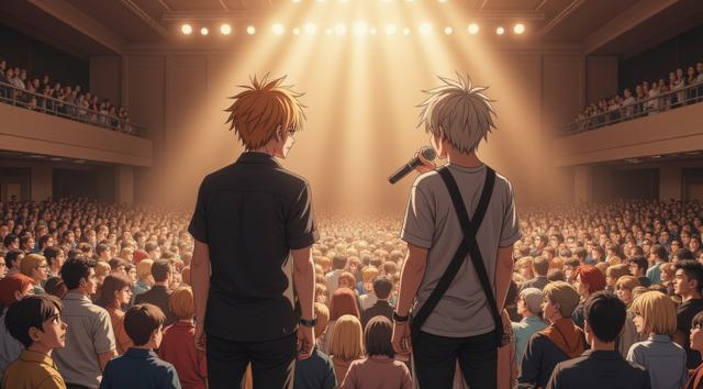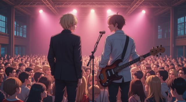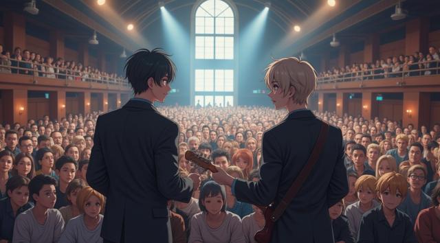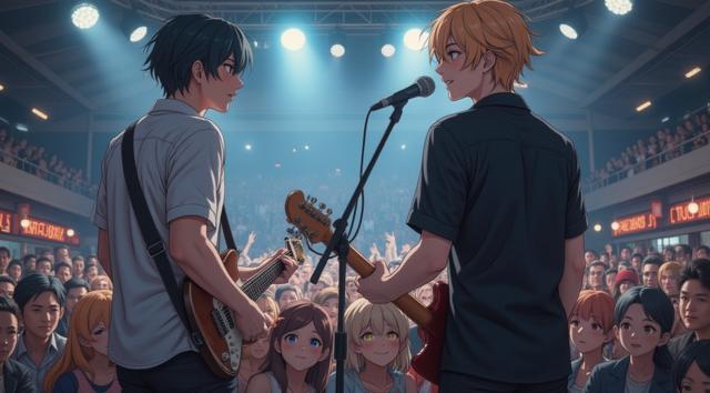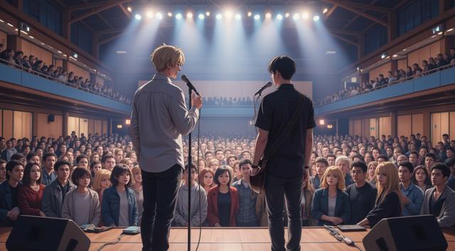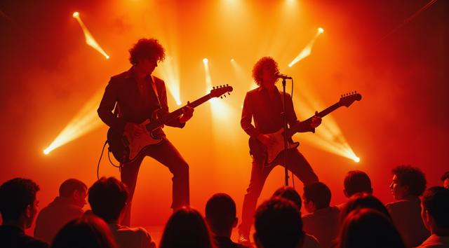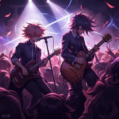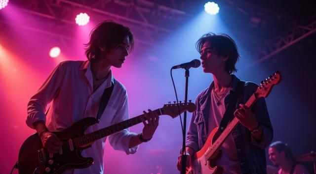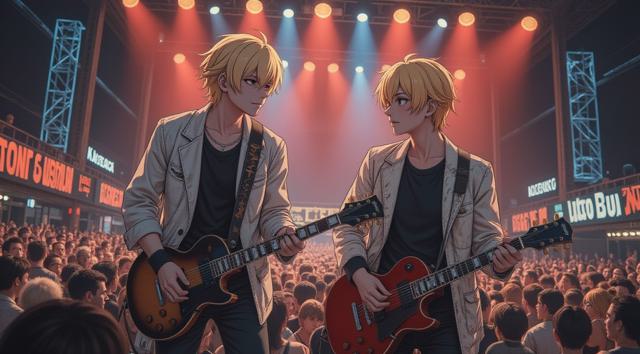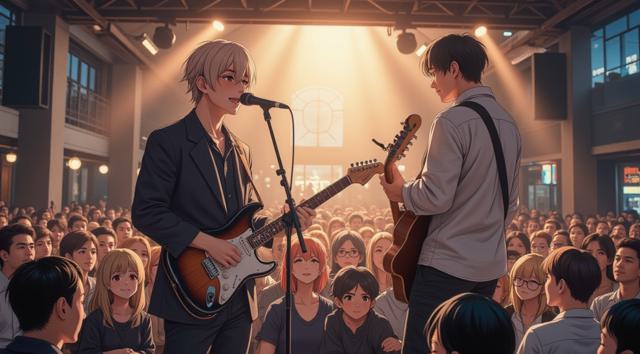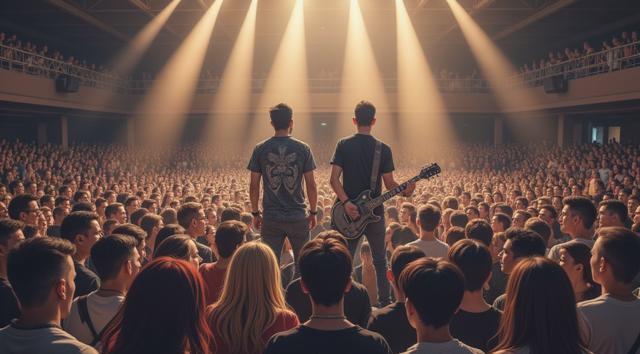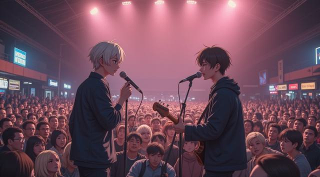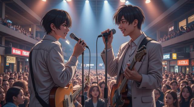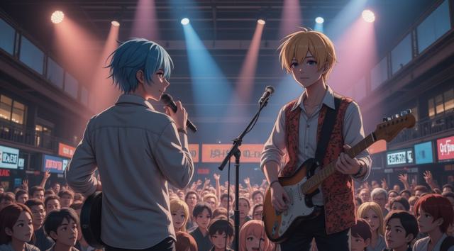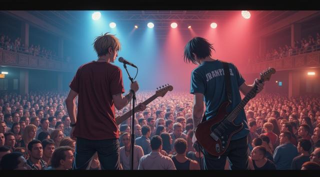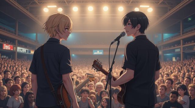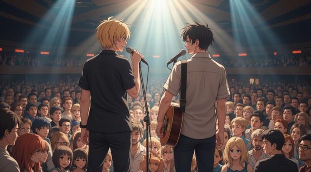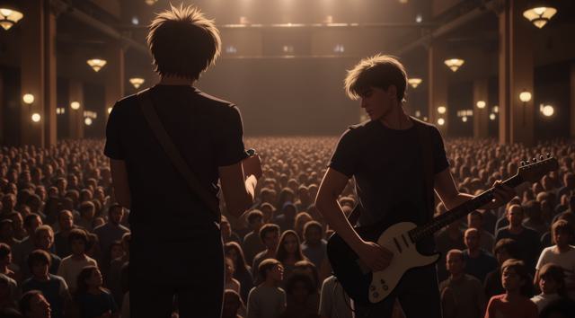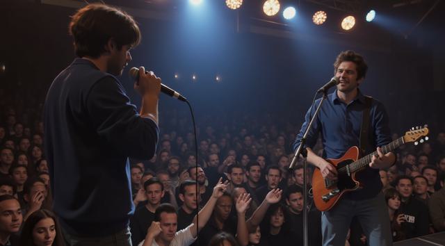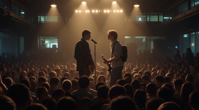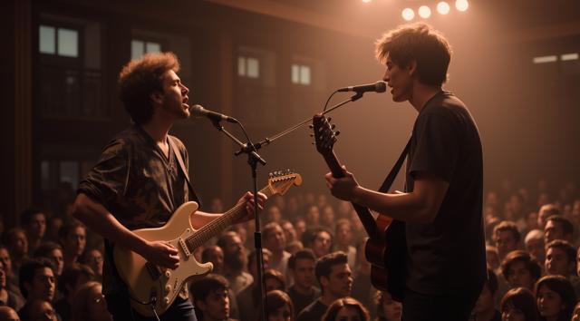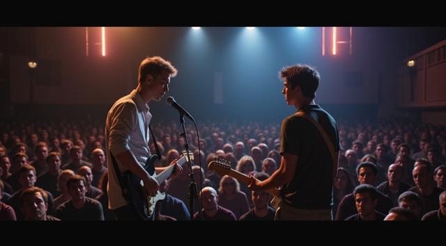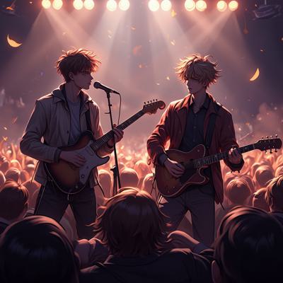 мужской дуэт, вокалист только с микрофоном и гитарист только с гитарой, выступают на сцене в закрытом помещении перед плотной толпой. Яркое освещение