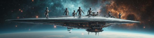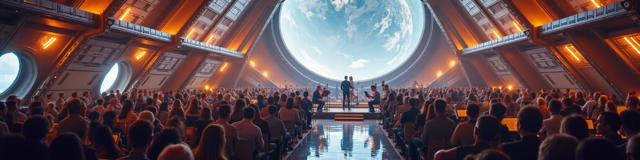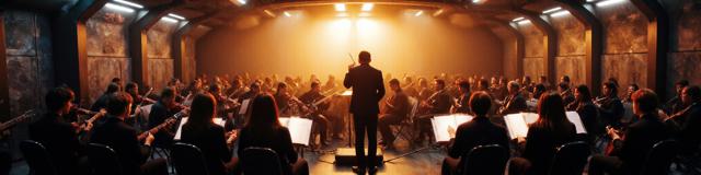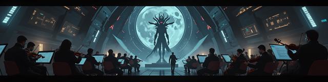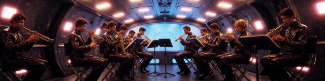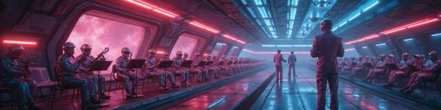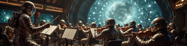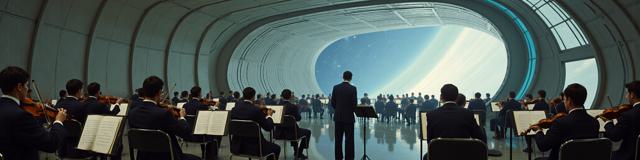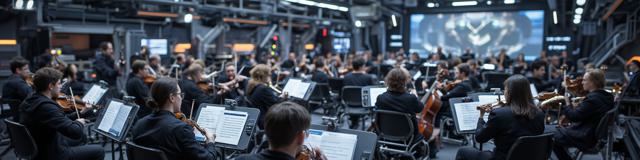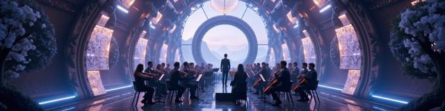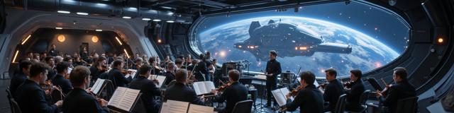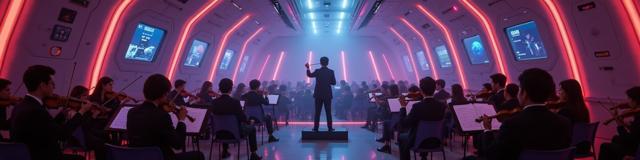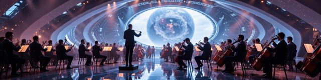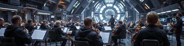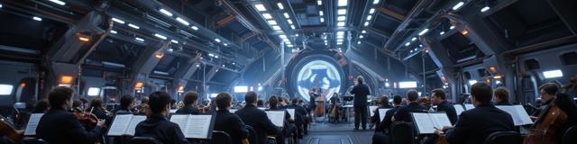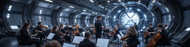 академический симфонический оркестр исполняет современную музыку внутри футуристичного космического корабля