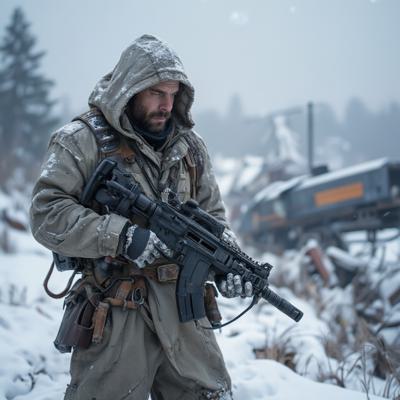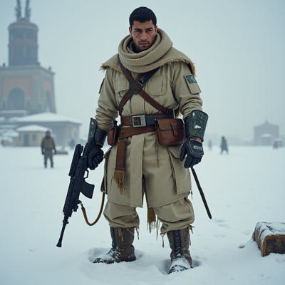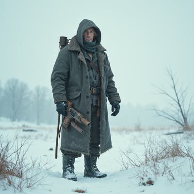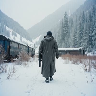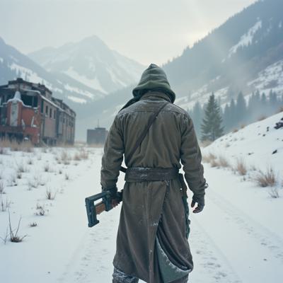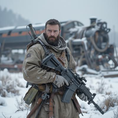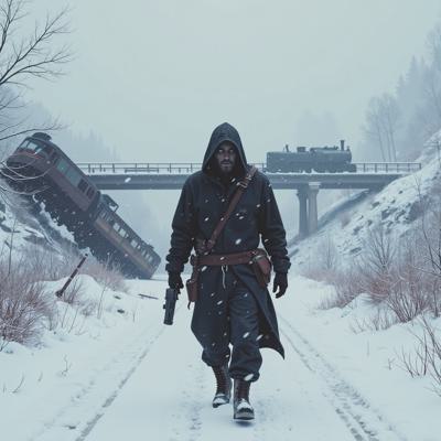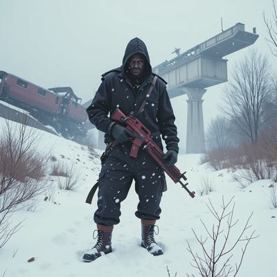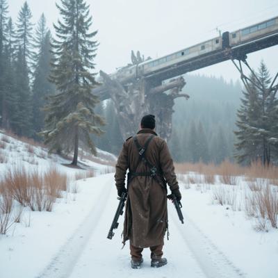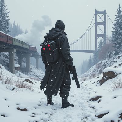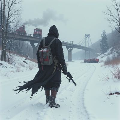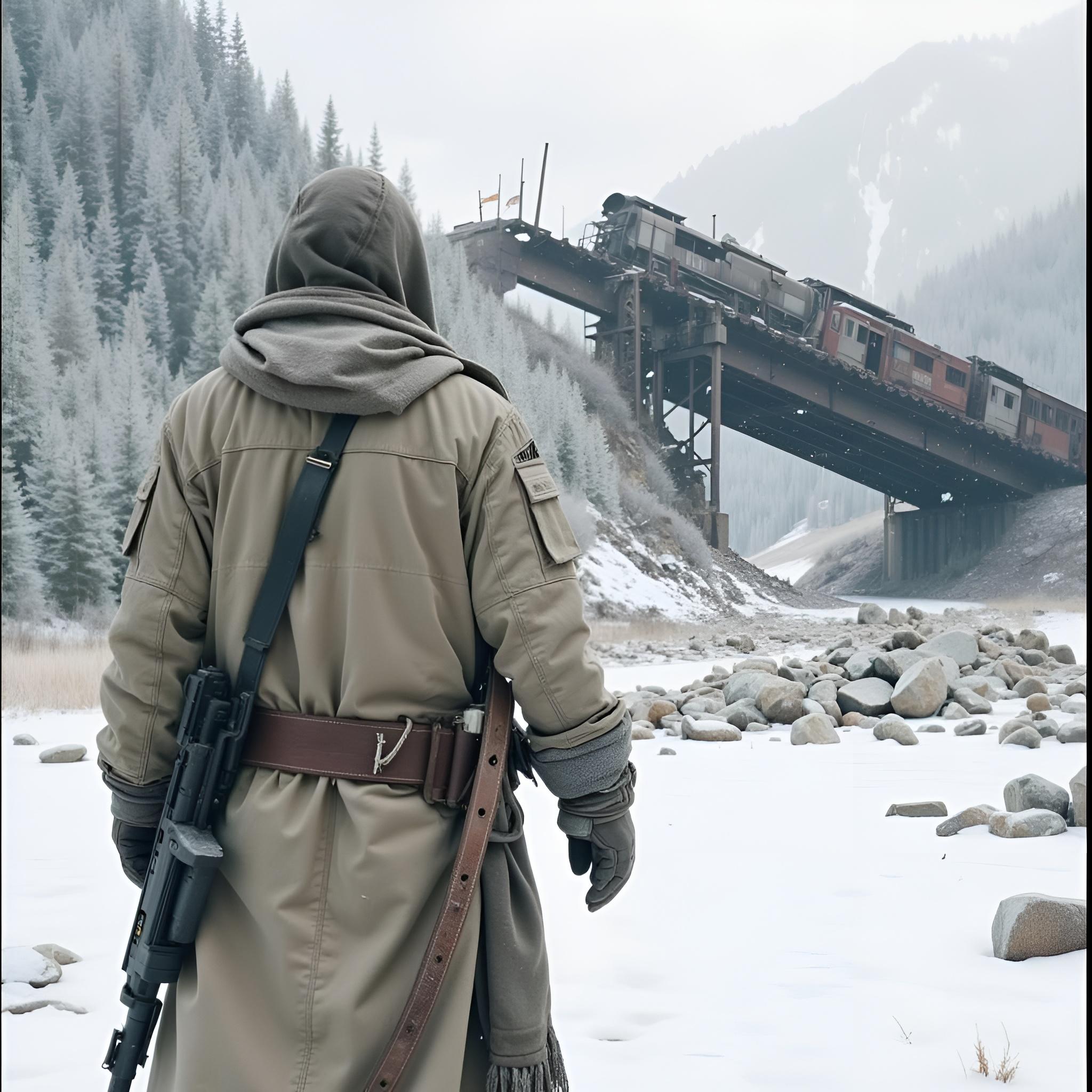 ядерная зима. В полный рост, спиной к камере стоит человек в лохмотьях и с бластером в руках. Вокруг закрытая заснеженная локация. На втором плане отчетливо видны обломки разрушенного моста и упавший с него разбитый поезд. [Улучшение лиц + качество x2 ]