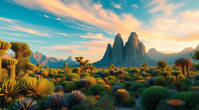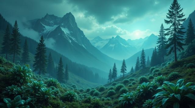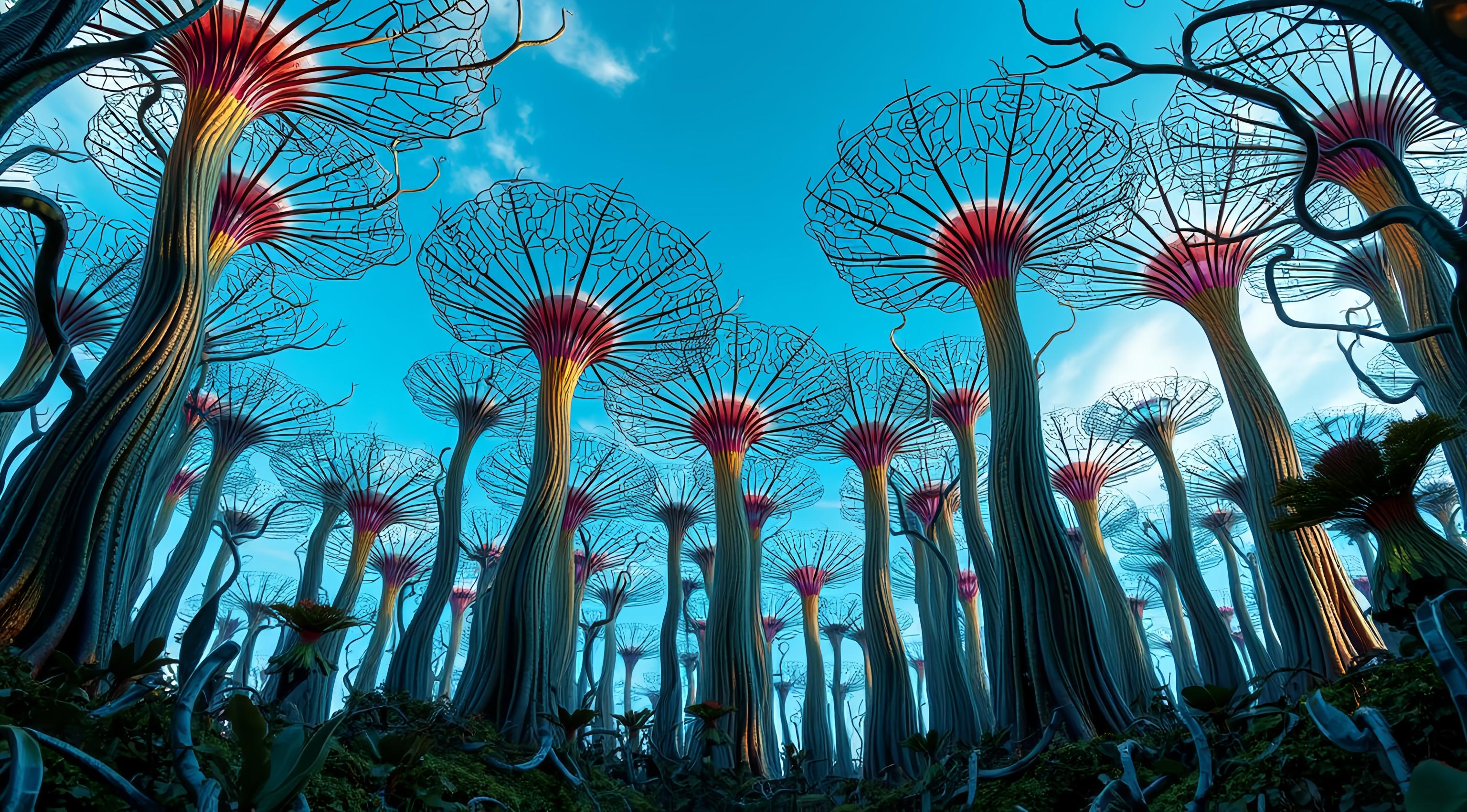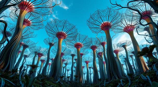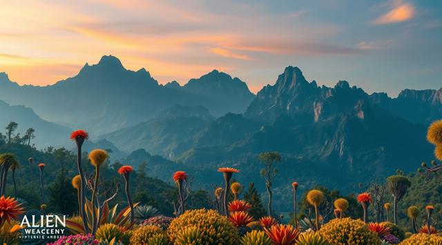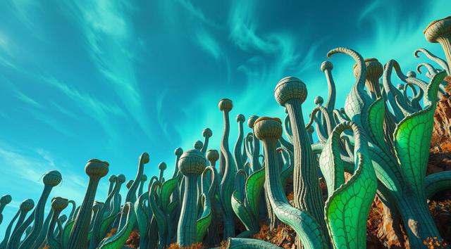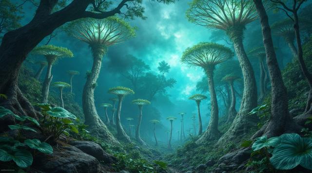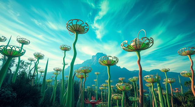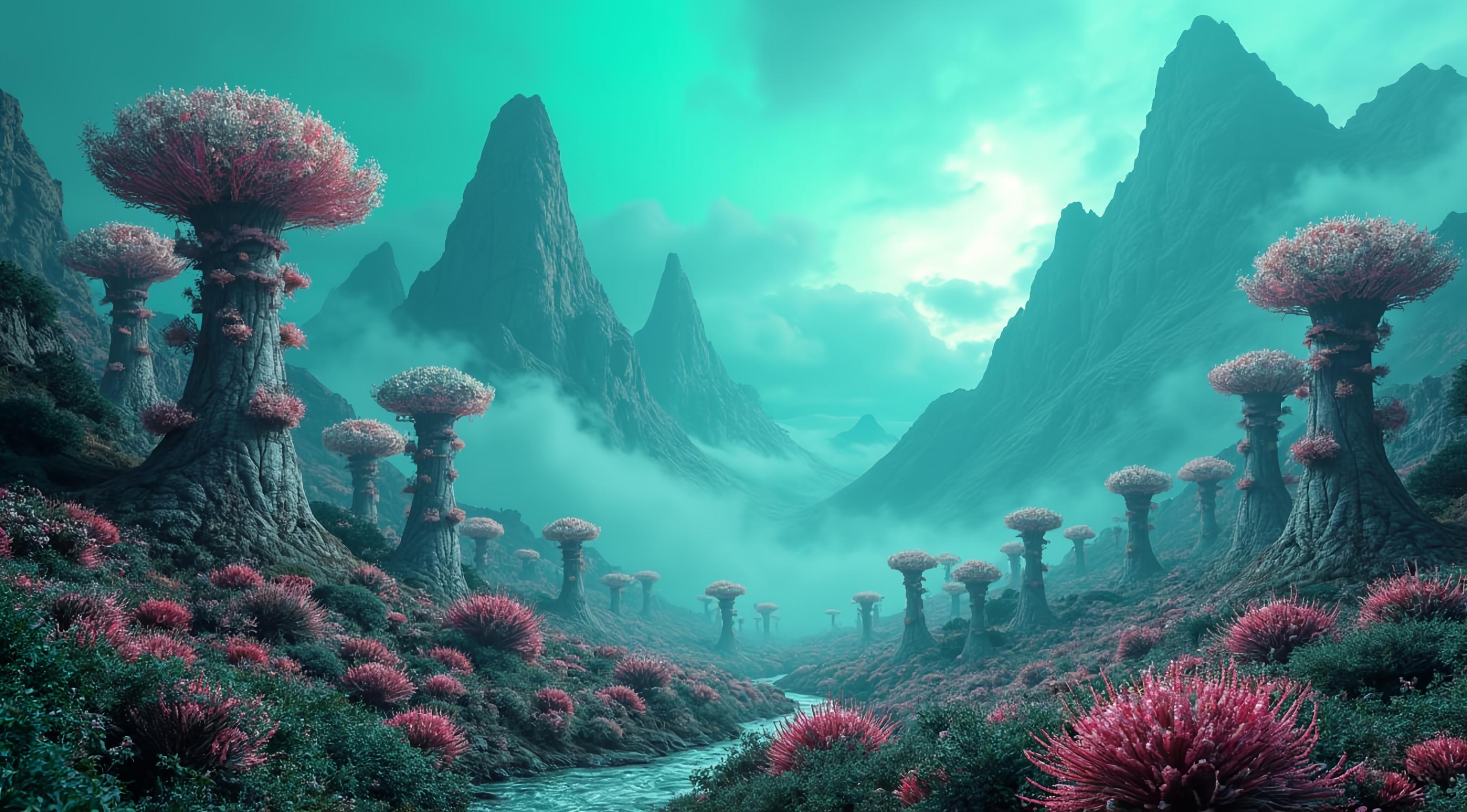 красивый инопланетный лесной пейзаж с необычными растениями, иссиня-зеленым небом и высокими горами [Улучшение лиц + качество x2 ]