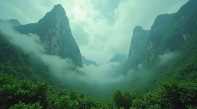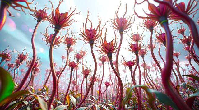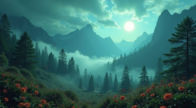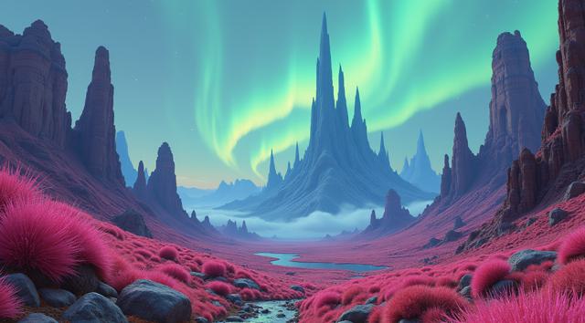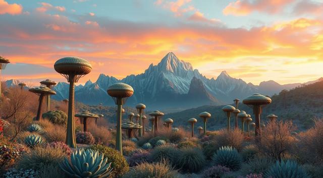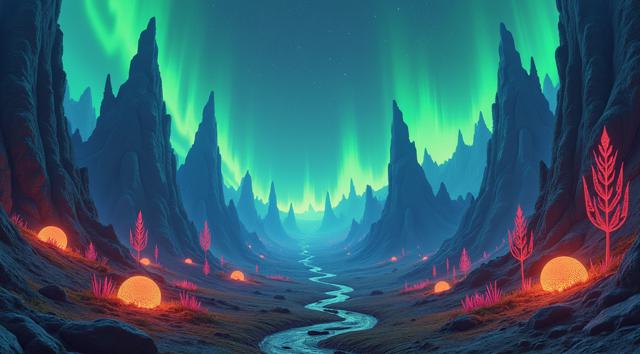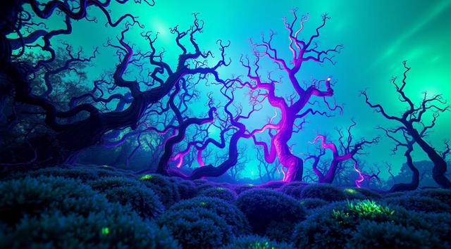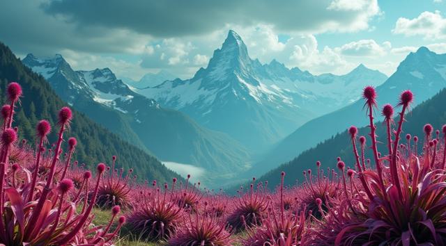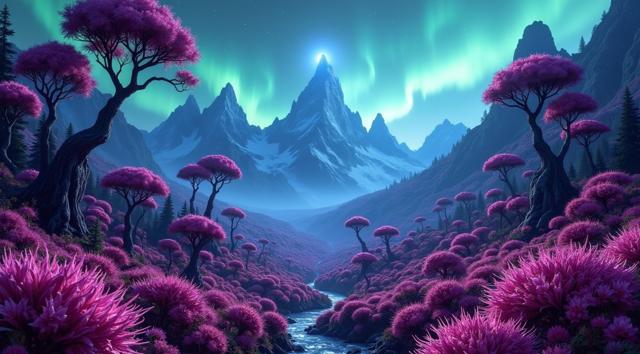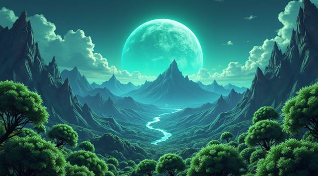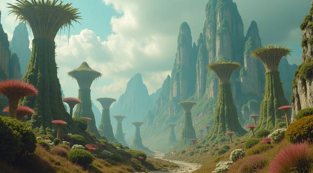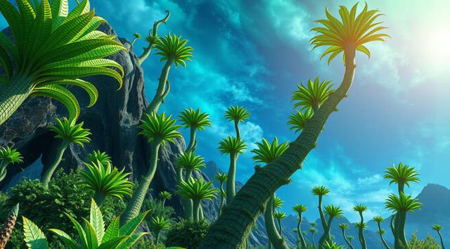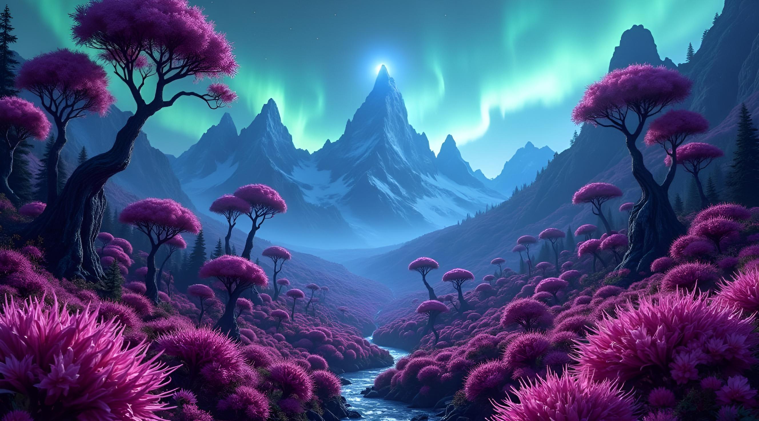 красивый инопланетный лесной пейзаж с необычными растениями, иссиня-зеленым небом и высокими горами [Улучшение лиц + качество x2 ]