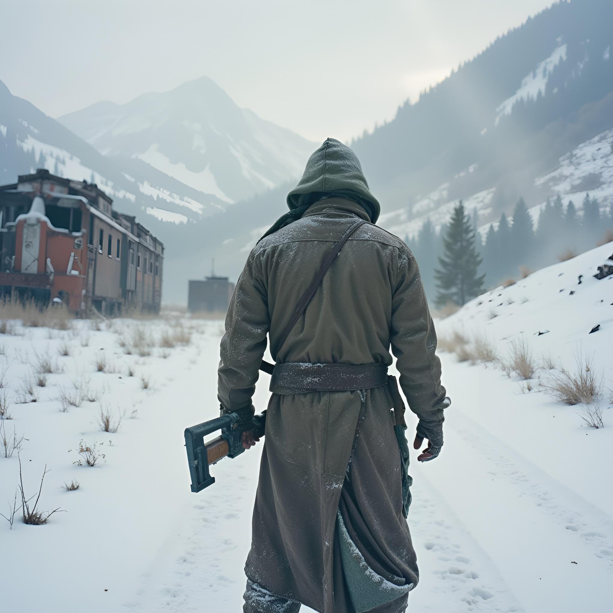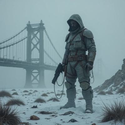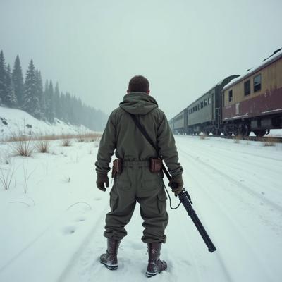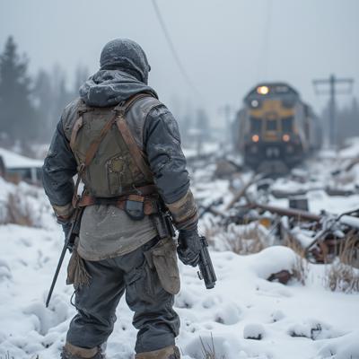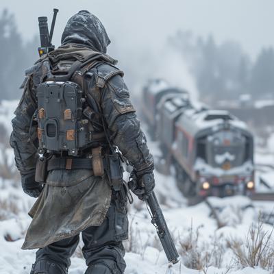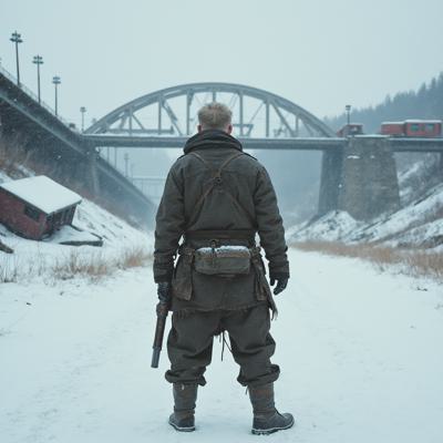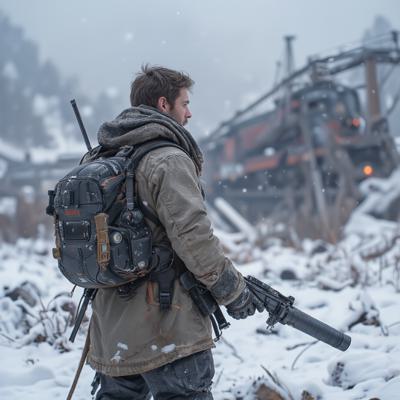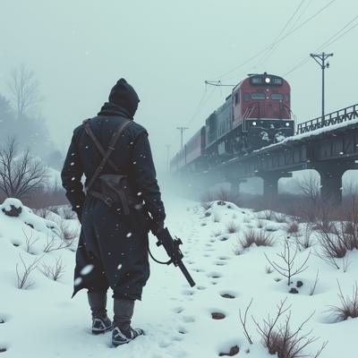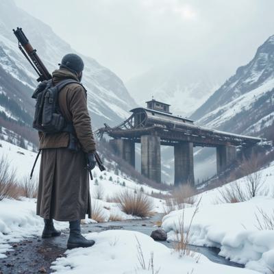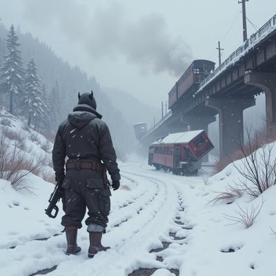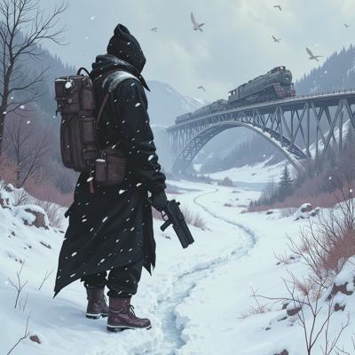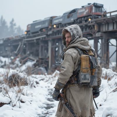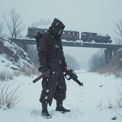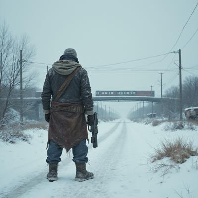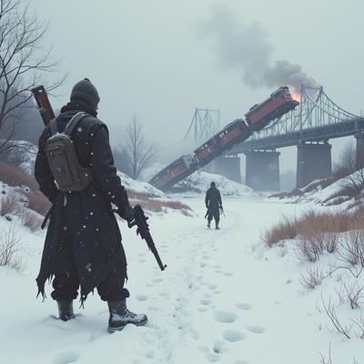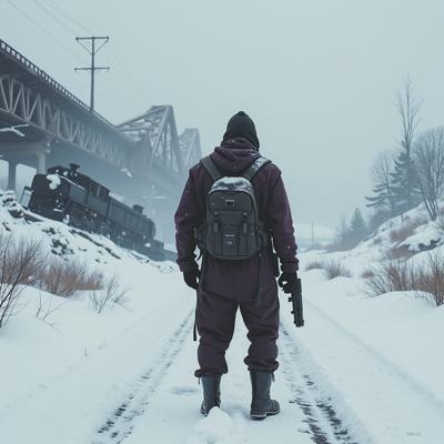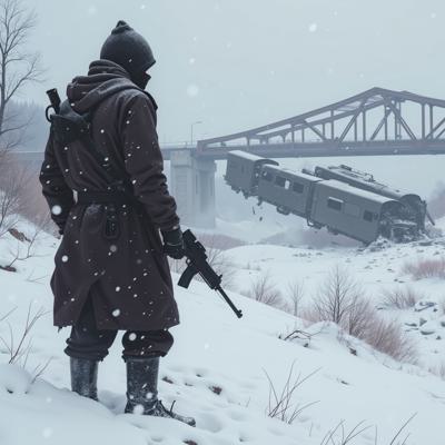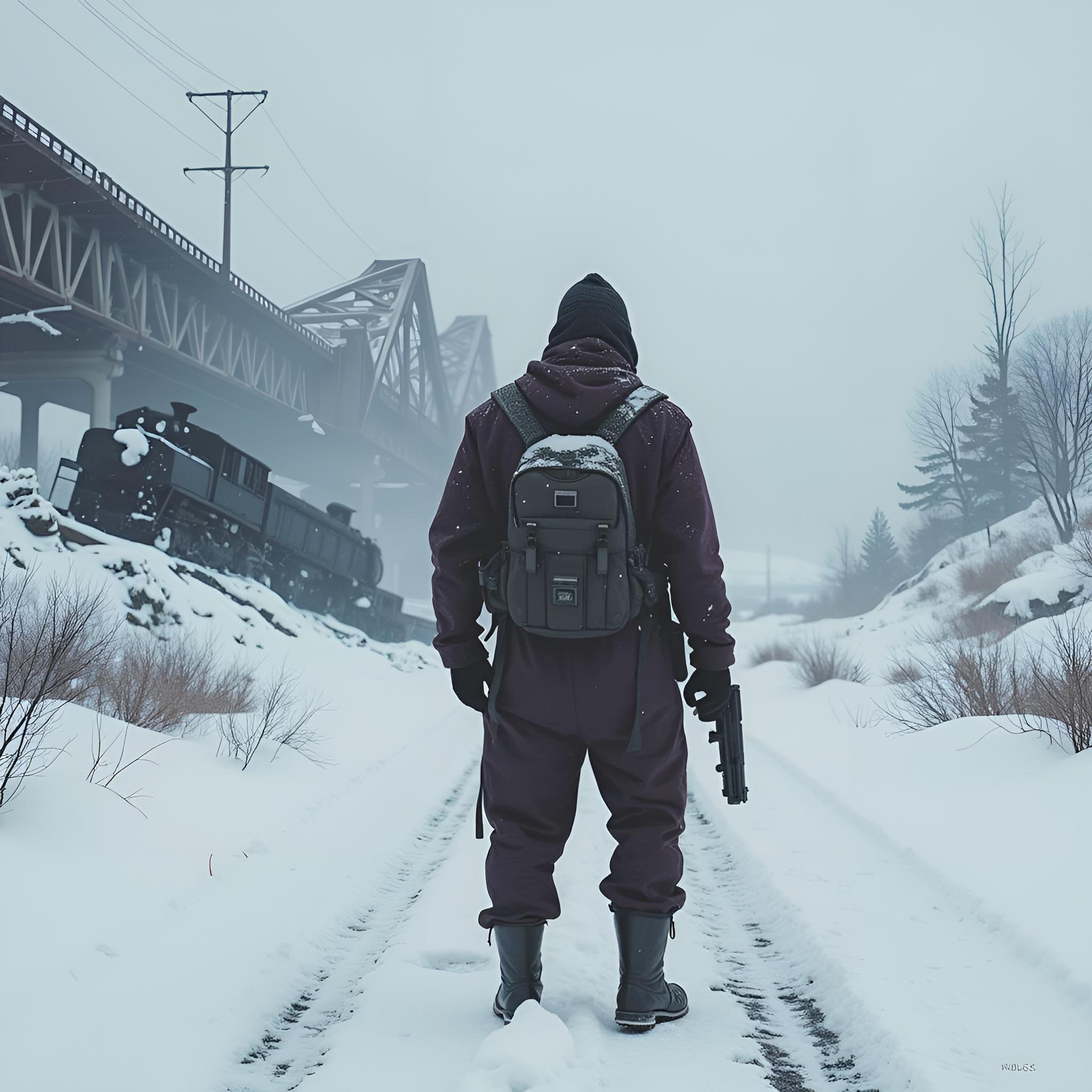 ядерная зима. В полный рост, спиной к камере стоит человек в лохмотьях и с бластером в руках. Вокруг закрытая заснеженная локация. На втором плане отчетливо видны обломки разрушенного моста и упавший с него разбитый поезд.
