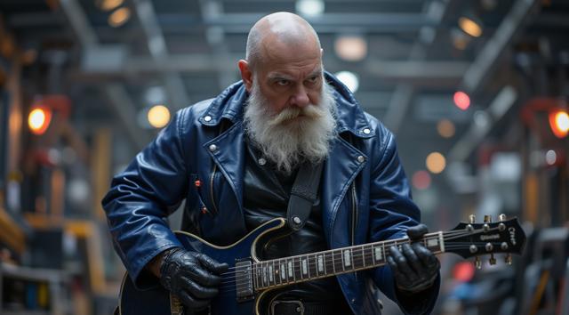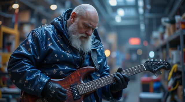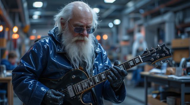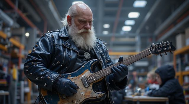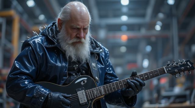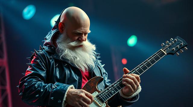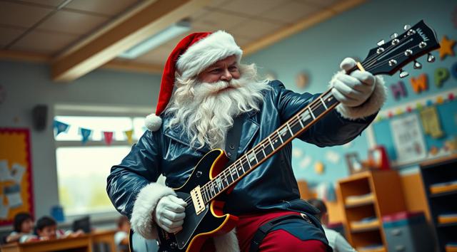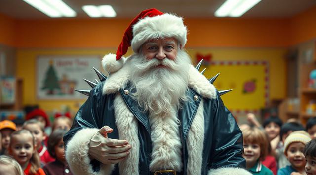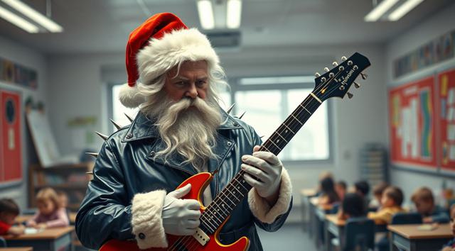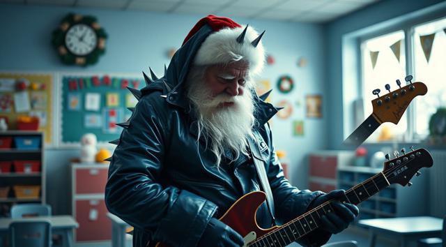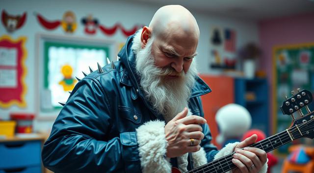 Лысый Дед Мороз в темно-синем кожаном плаще с шипами играет на электрогитаре в детском саду