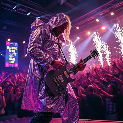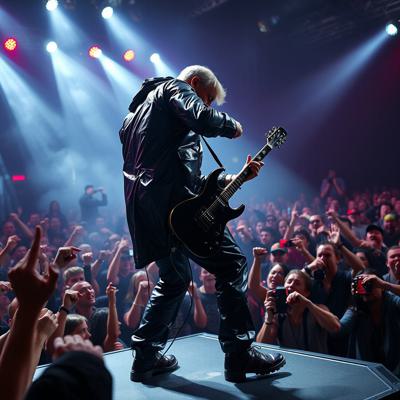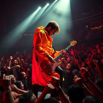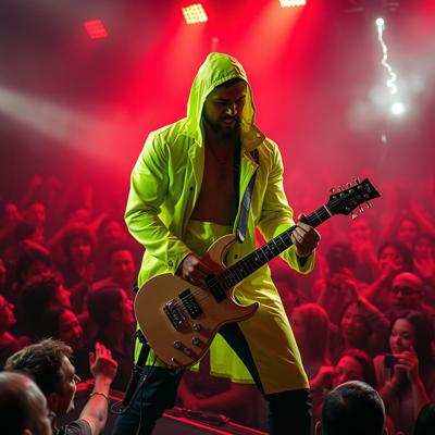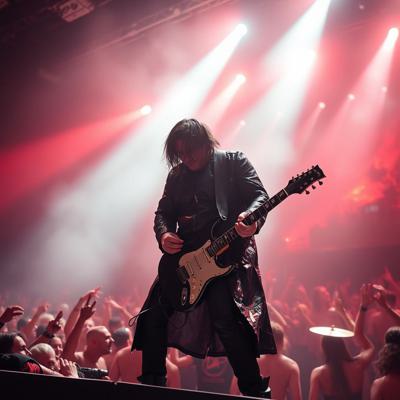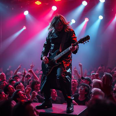 в полный рост. мужчина в плаще с электрогитарой играет метал на сцене в закрытом помещении перед плотной толпой