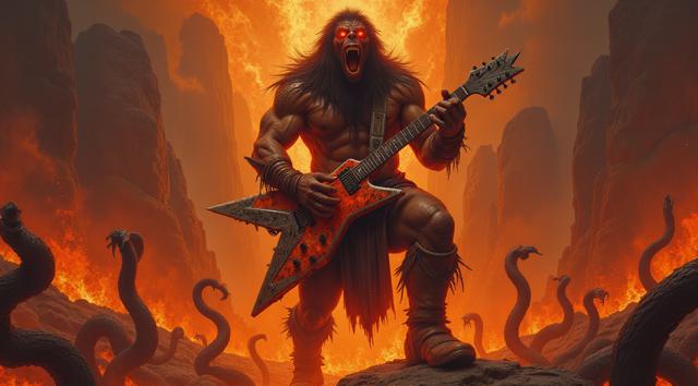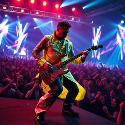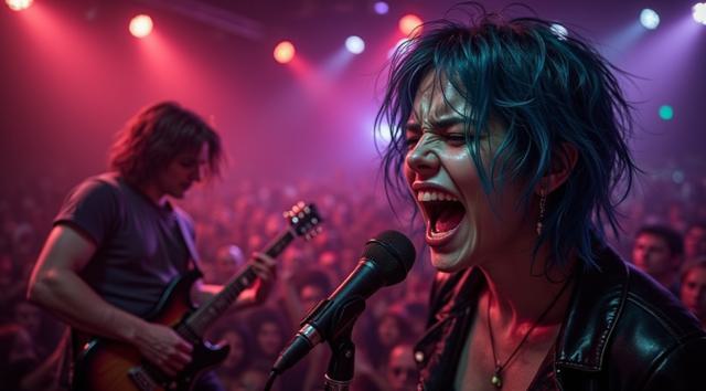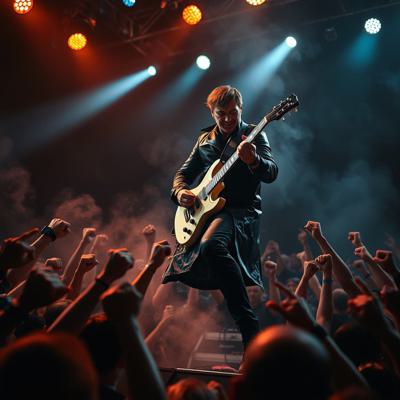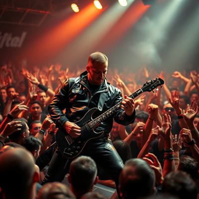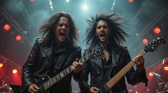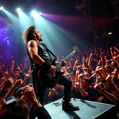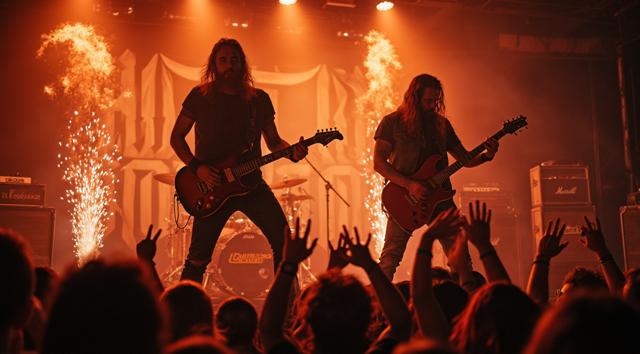 в полный рост. вокалист с микрофоном и гитарист с электрогитарой играют метал на сцене в закрытом помещении перед плотной толпой. Фаершоу [Улучшение лиц + качество x2 ]