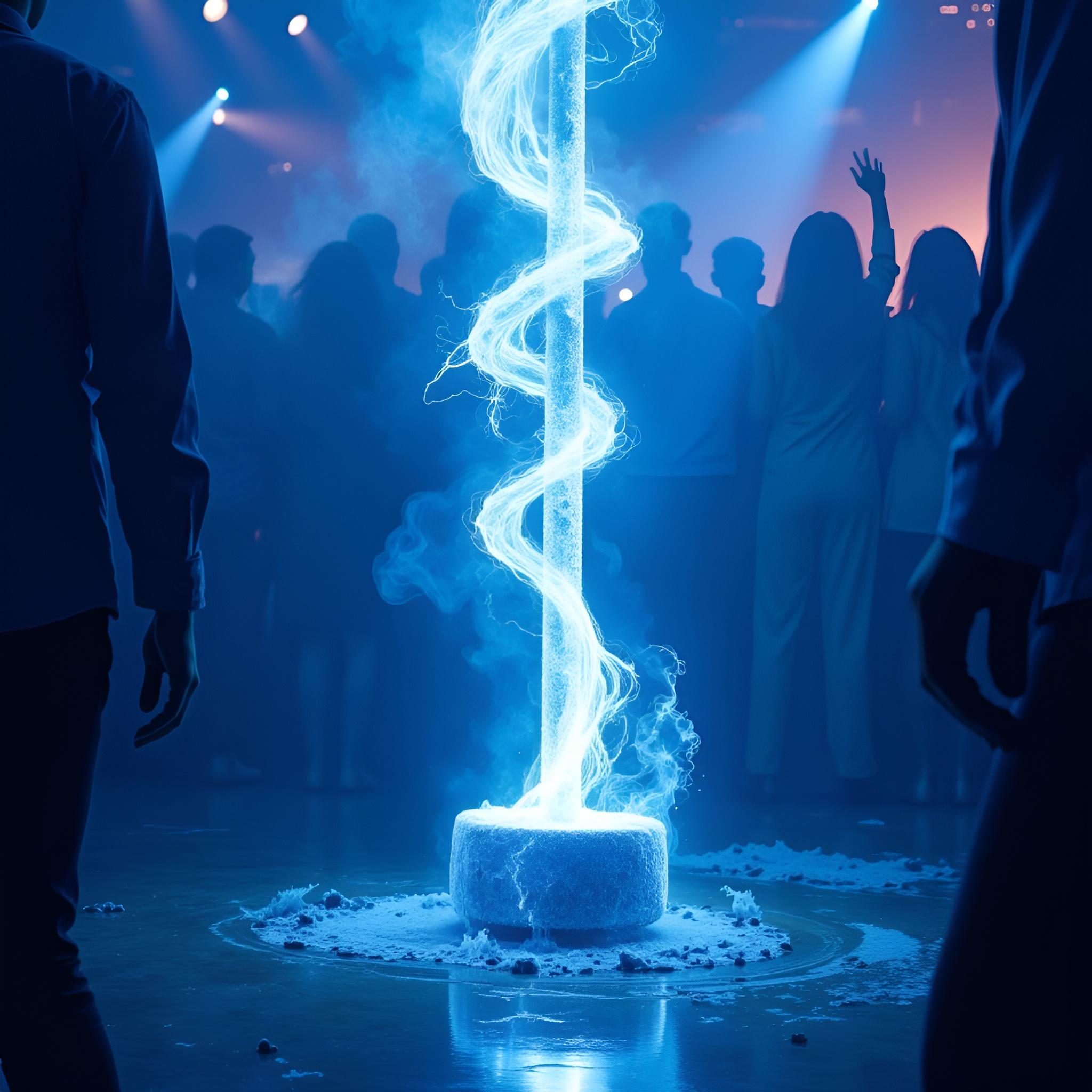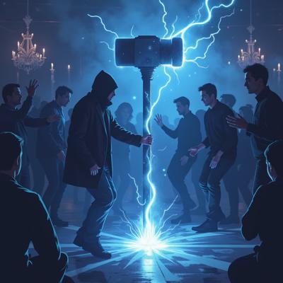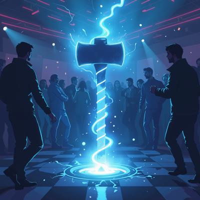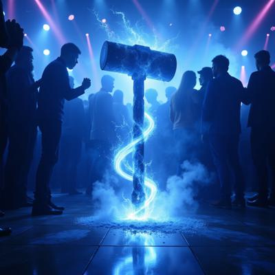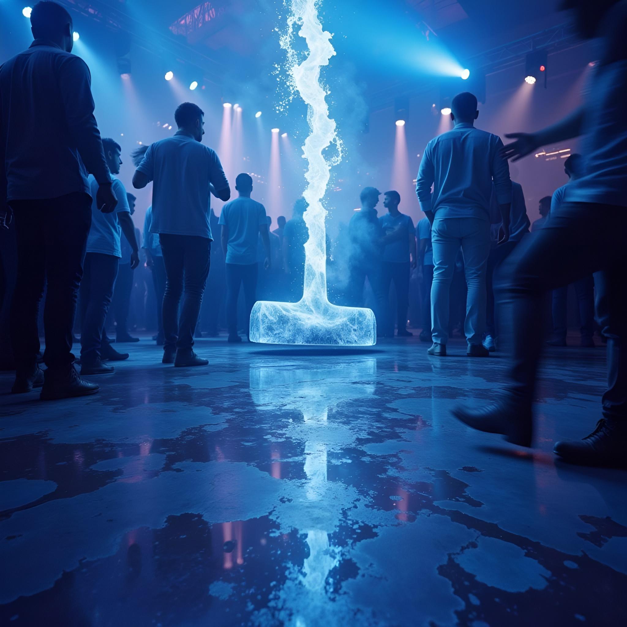 в голубых тонах. посреди танцпола в окружении удивленных людей огромный молоток торчит рукоятью вверх из пробитого им пола. от рукоятки молотка расходится спиралевидный яркий плазменный след [Улучшение лиц + качество x2 ]