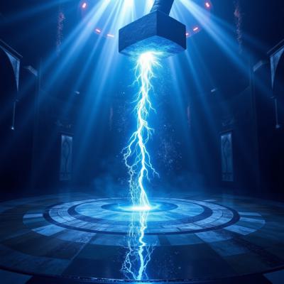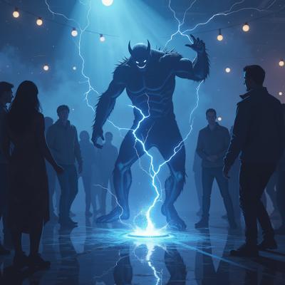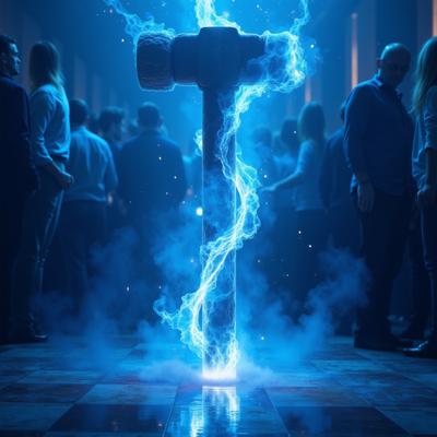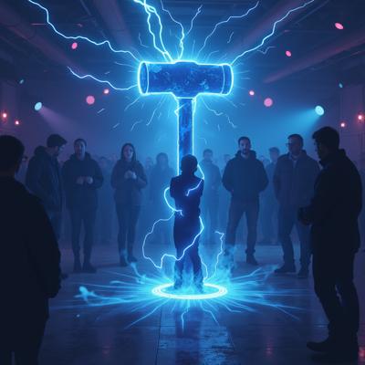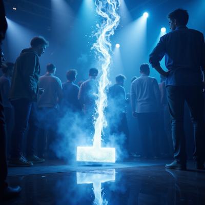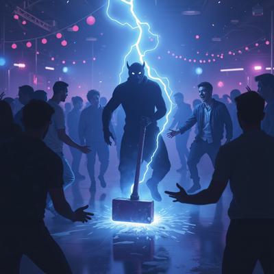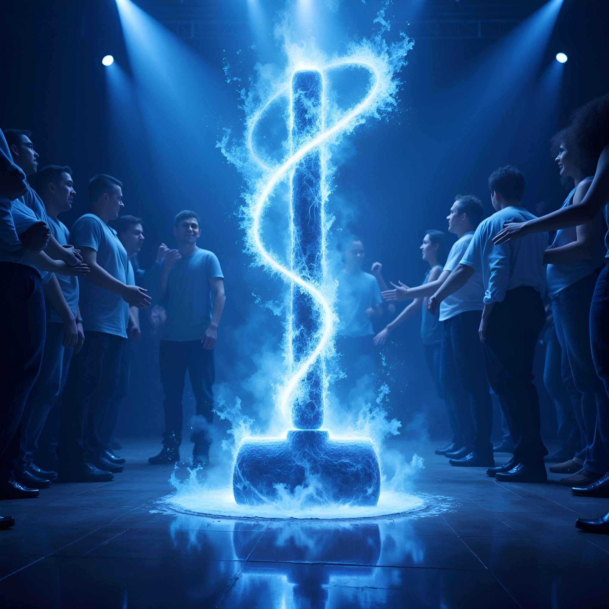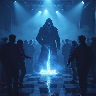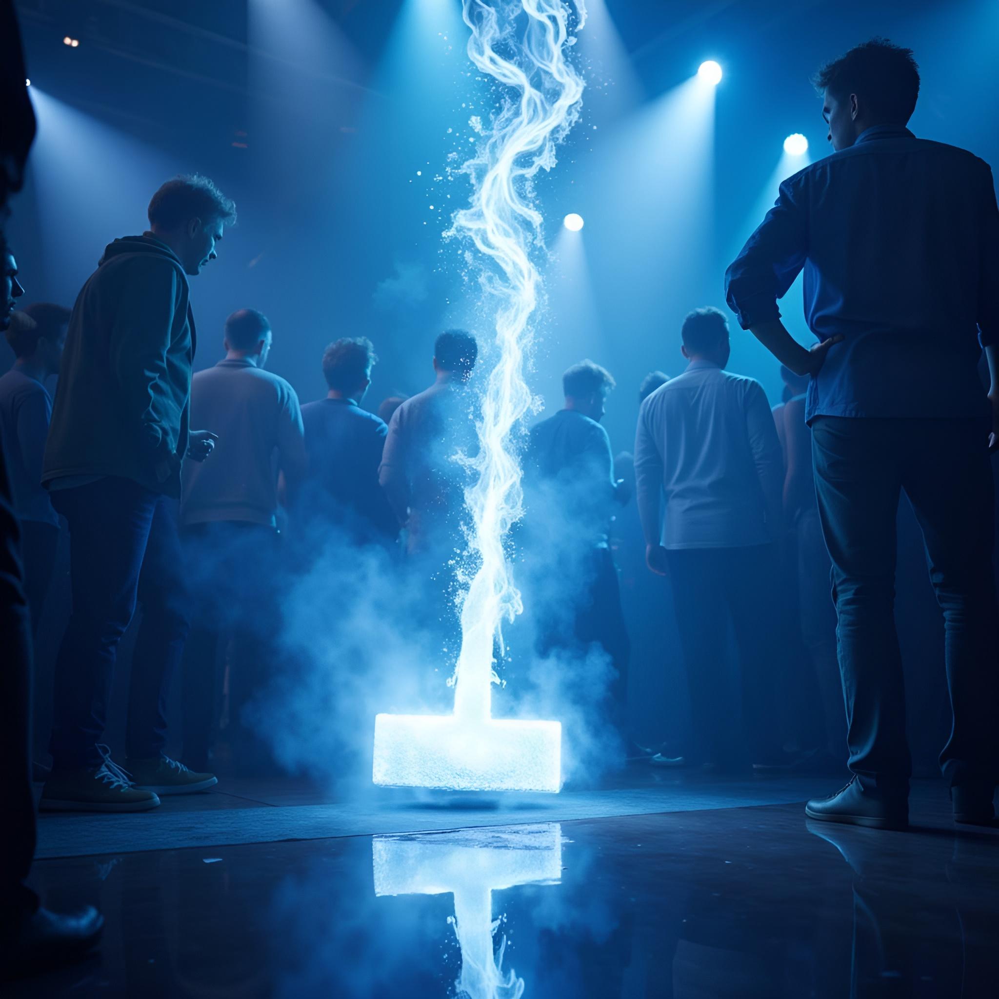 в голубых тонах. посреди танцпола в окружении удивленных людей огромный молоток торчит рукоятью вверх из пробитого им пола. от рукоятки молотка расходится спиралевидный яркий плазменный след [Улучшение лиц + качество x2 ]