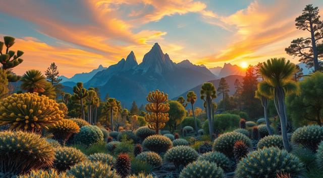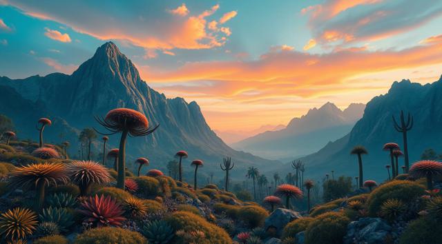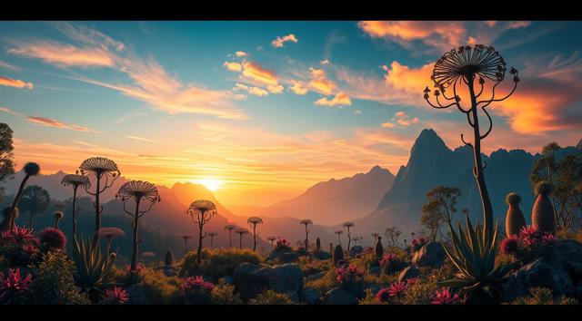 красивый инопланетный лесной пейзаж с необычными растениями, иссиня-оранжевым небом и высокими горами