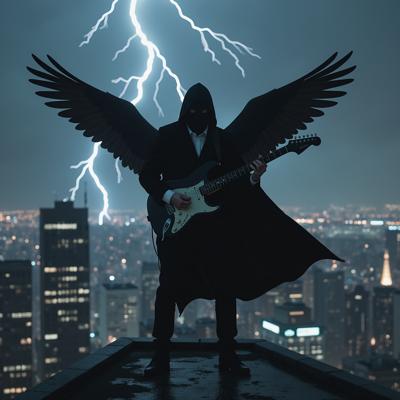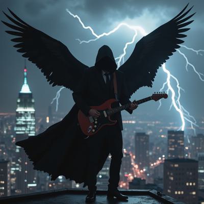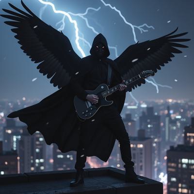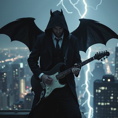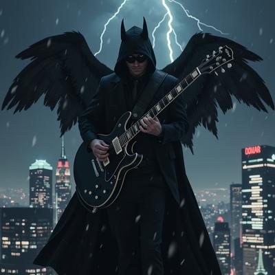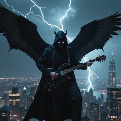 мужчина в черном костюме и черном плаще с капюшоном, с черными крыльями за спиной, играет на электрогитаре, стоя на крыше небоскреба в грозу