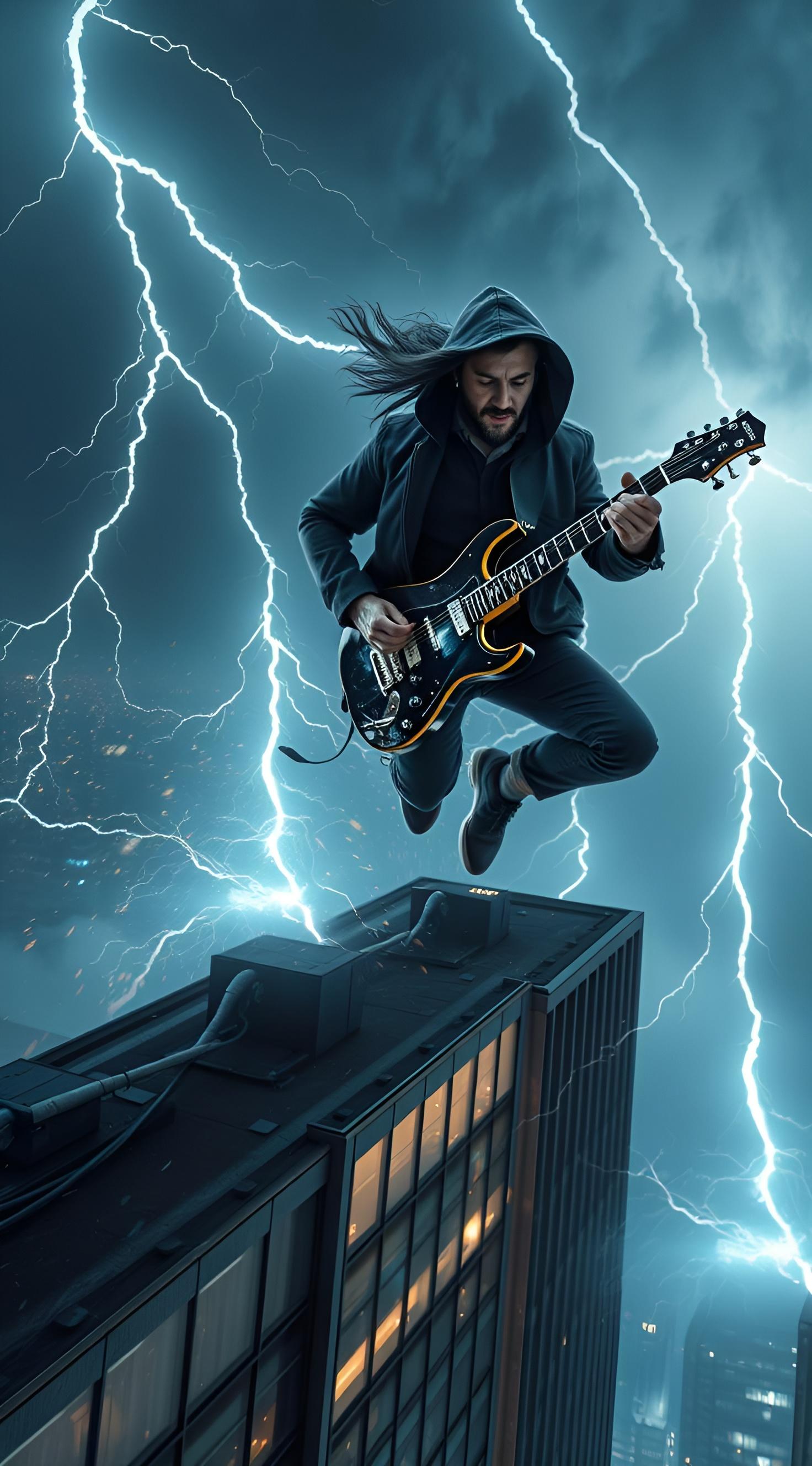 мужчина в черном тренче с капюшоном играет на электрогитаре, стоя на крыше небоскреба посреди мощной грозы [Улучшение лиц + качество x2 ]