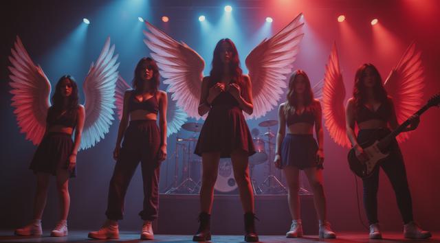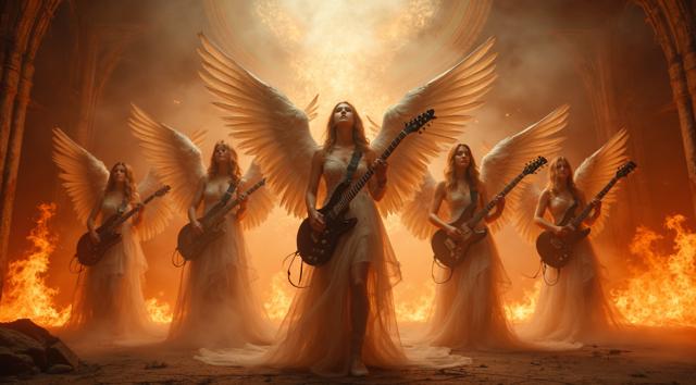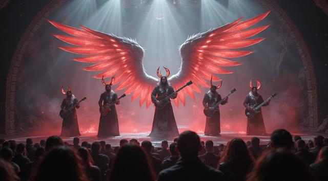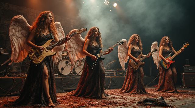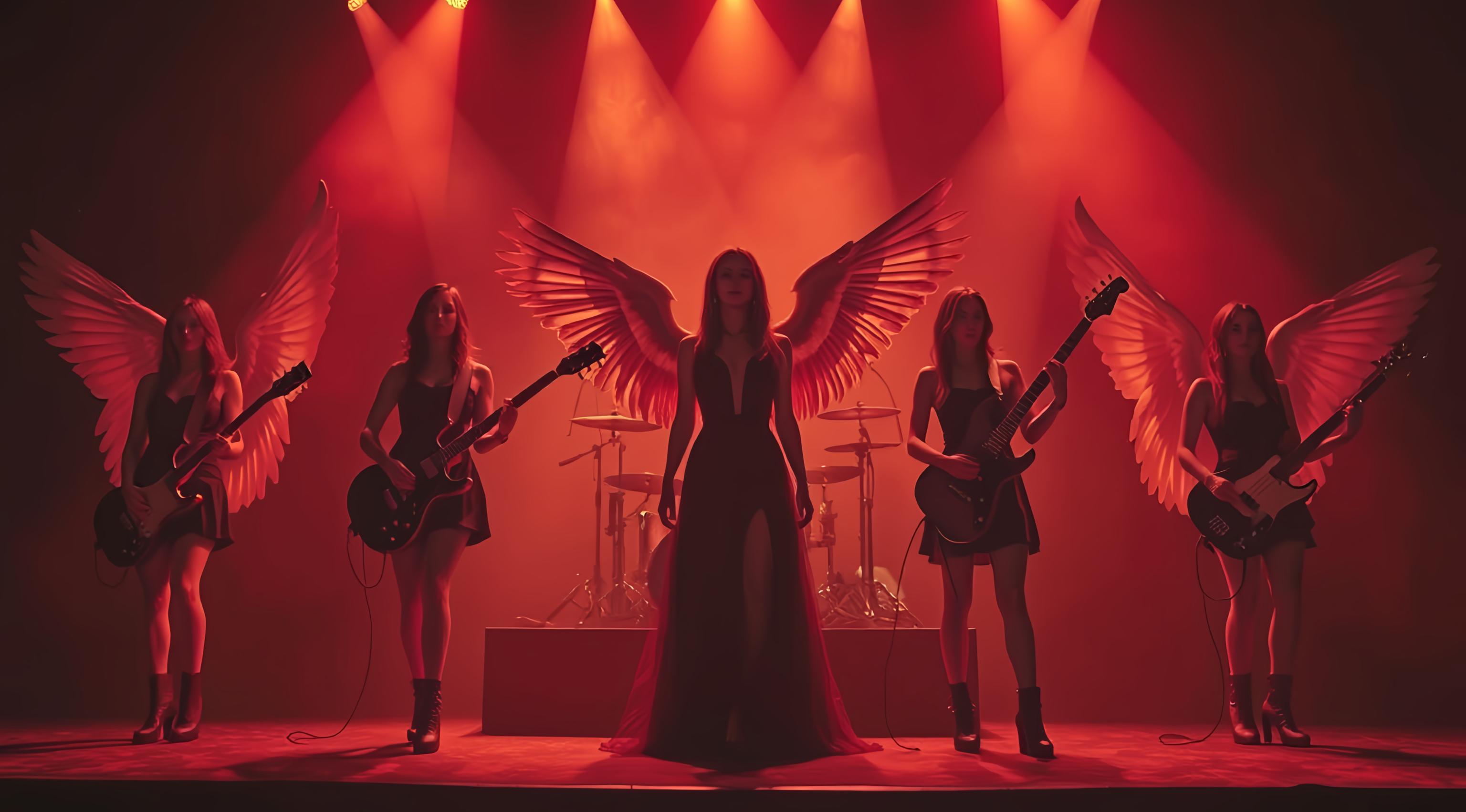 женский музыкальный коллектив в образах ангелов и демонов играет на сцене power metal [Улучшение лиц + качество x2 [Улучшение крупных деталей ]]