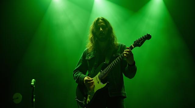 [Видео для #6300757 'в полный рост. вокалист с микрофоном и гитарист с электрогитарой играют метал на сцене в закрытом помещении перед плотной толпой. Лучи софитов ]'