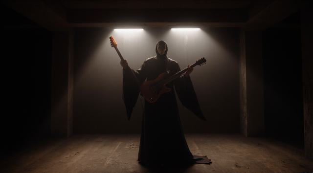 Призрак оперы в маске в пустом зале на пустой сцене играет на электрогитаре