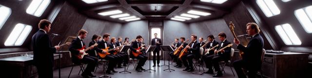 академический симфонический оркестр при участии электрогитар исполняют современную музыку внутри футуристичного космического корабля