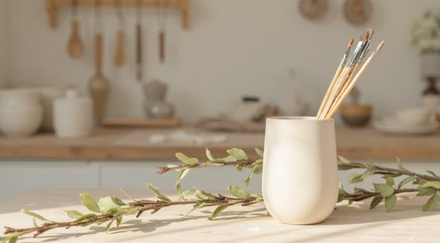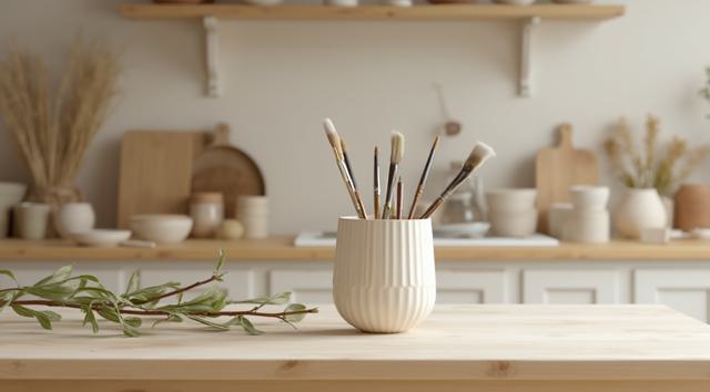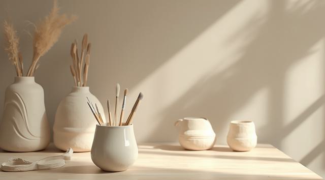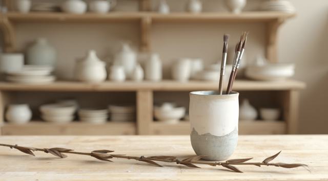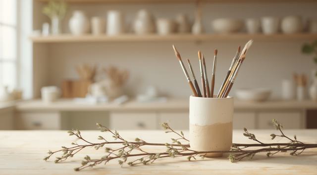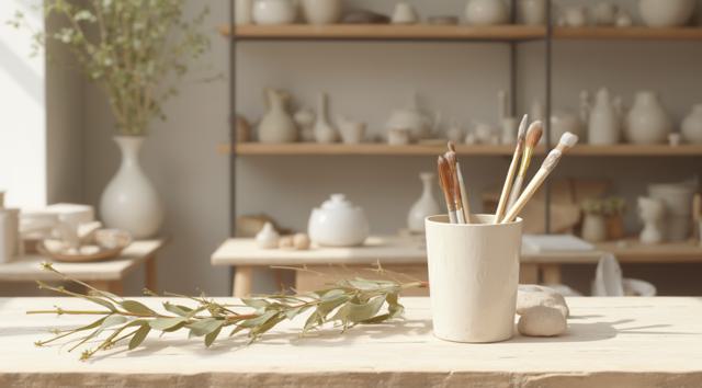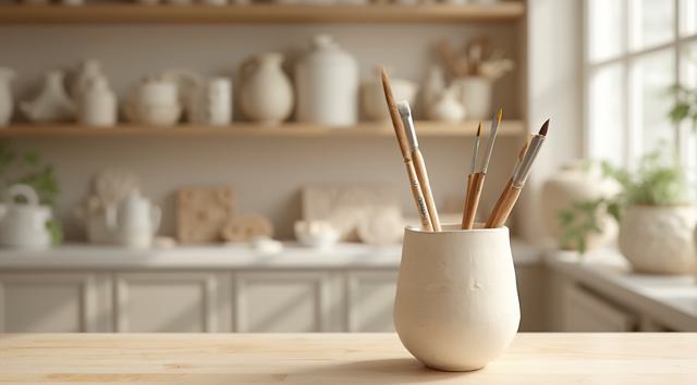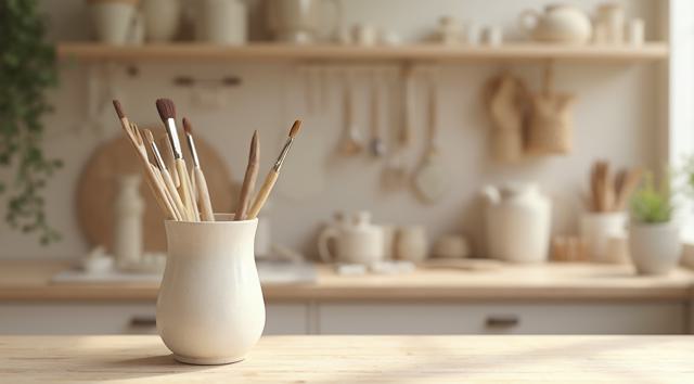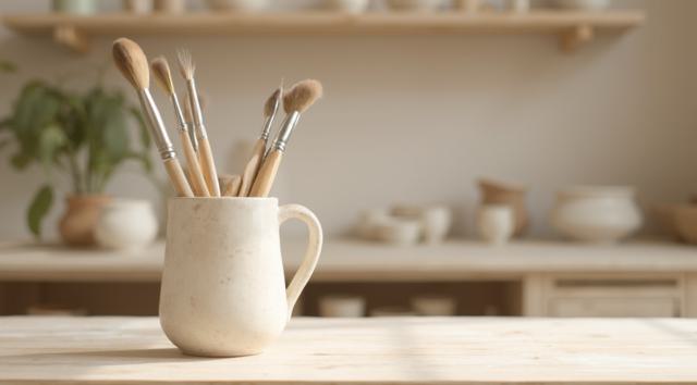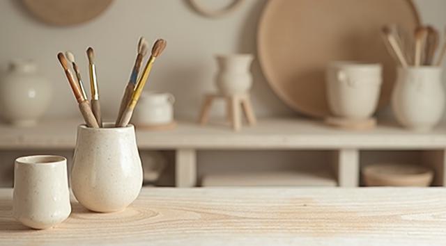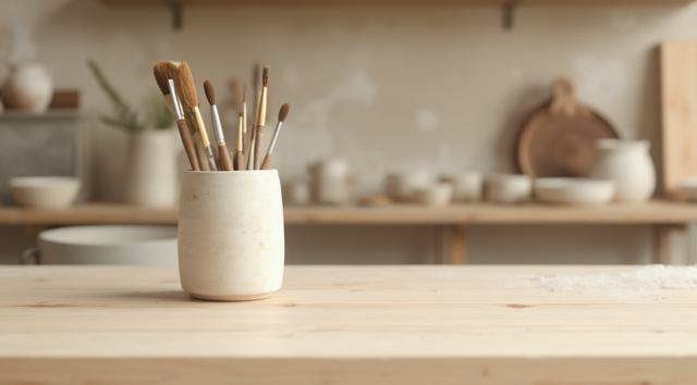 Светло-деревянный стол, на нём керамический стакан с кистями для рисования, на заднем фоне мастерская керамическая, всё в светло-бежевых тонах