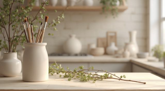 Светло-деревянный стол, на нём керамический стакан с кистями для рисования, на заднем фоне мастерская керамическая, всё в светло-бежевых тонах, На столе лежит ветка ивы