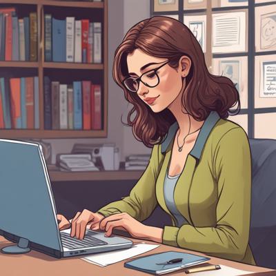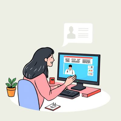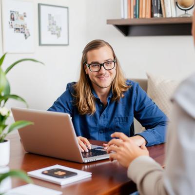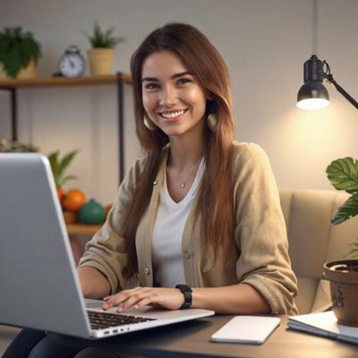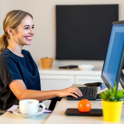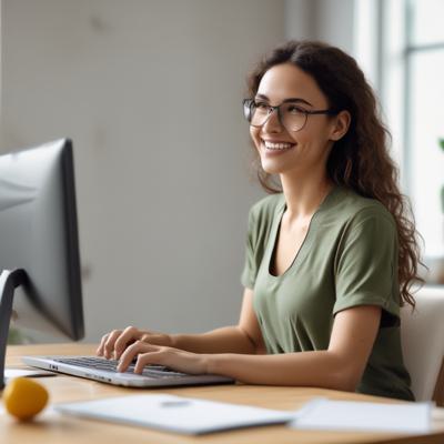 Девушка сидит за компьютером и проводит онлайн консультацию, улыбается (для user 208808 плод 5467799)