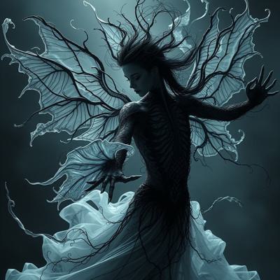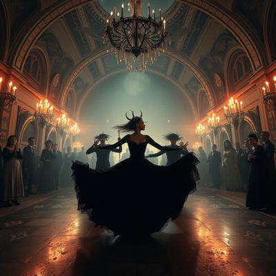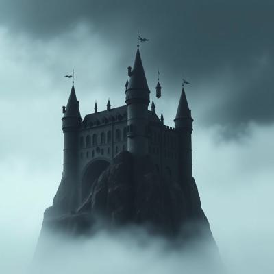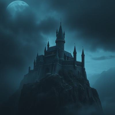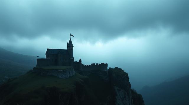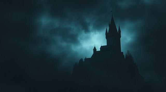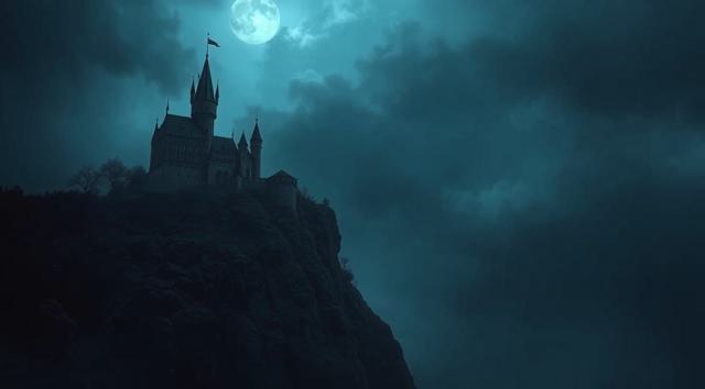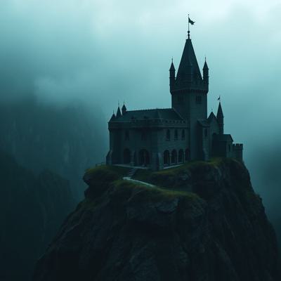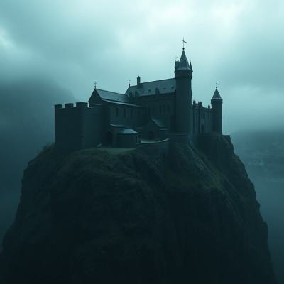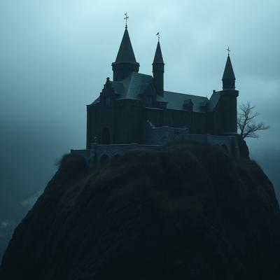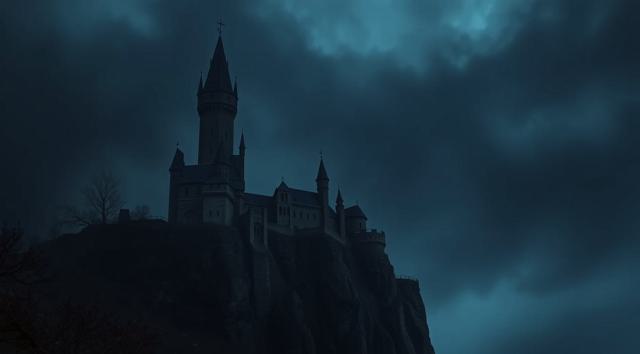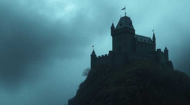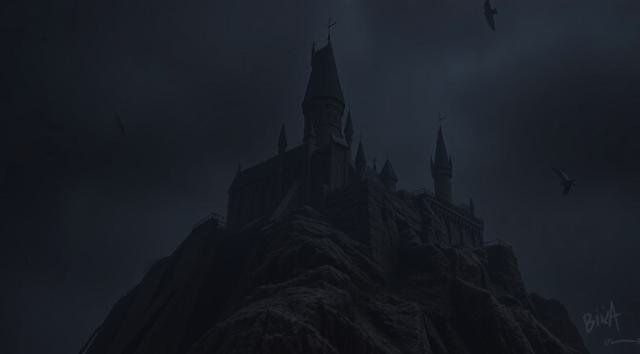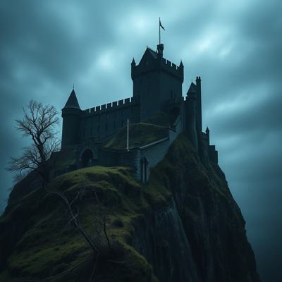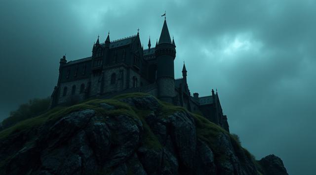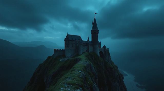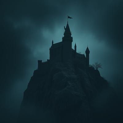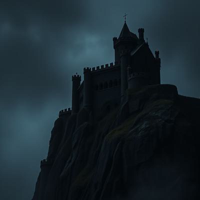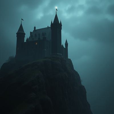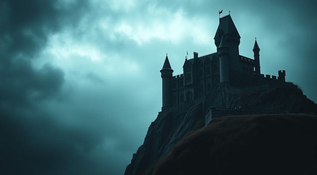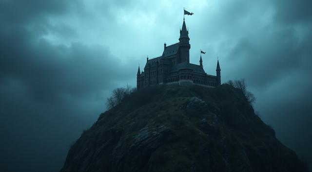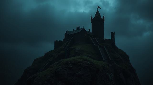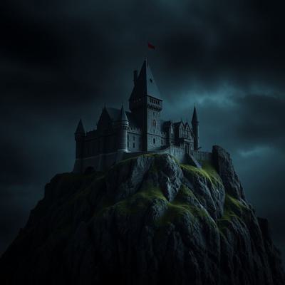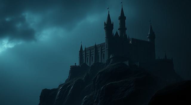 Одинокий черный замок с черными стенами стоит на скале в зловещей тьме