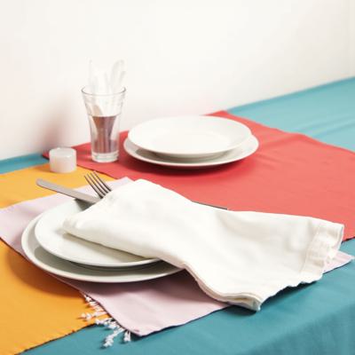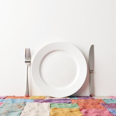 тарелка, вилка и нож лежат на цветной скатерти на столе, стол показан на 1 3, упирается в белую стену в графическом стиле