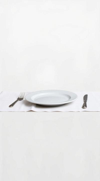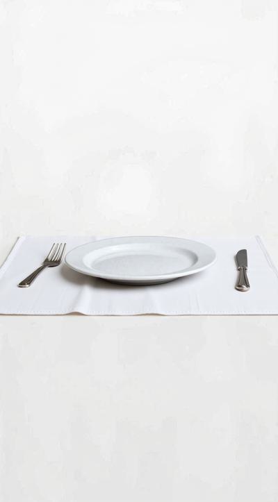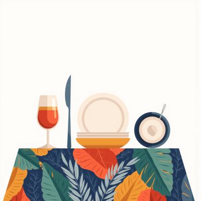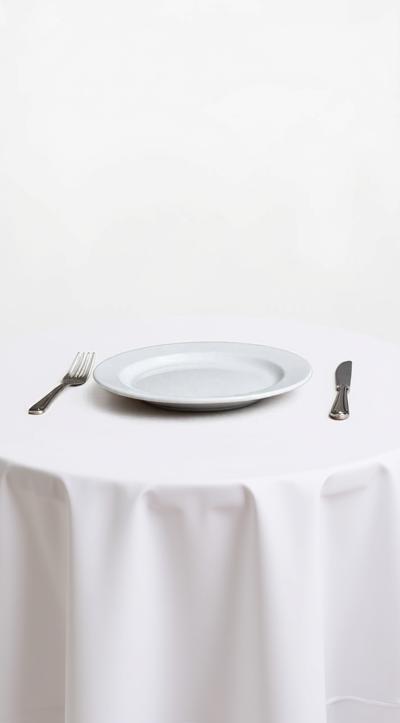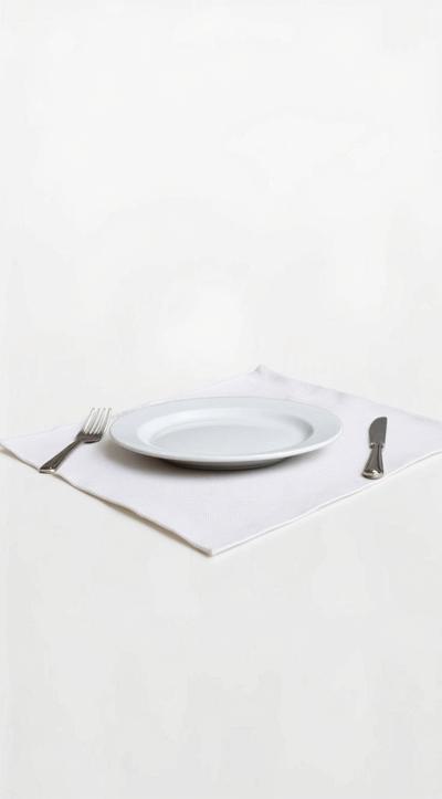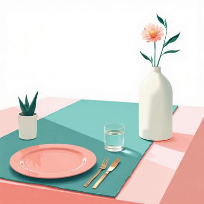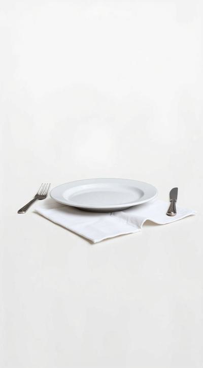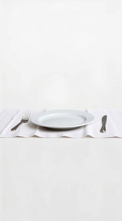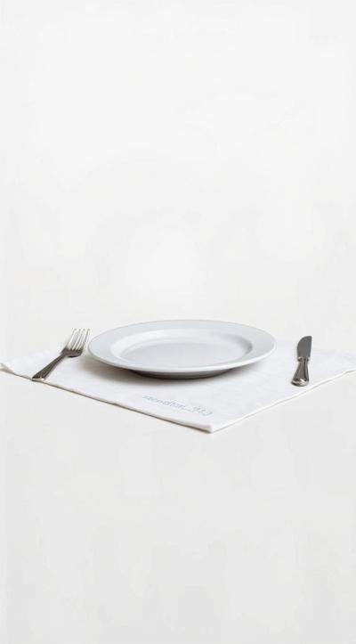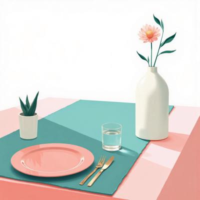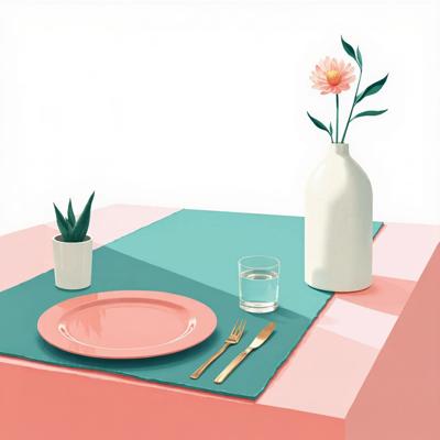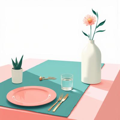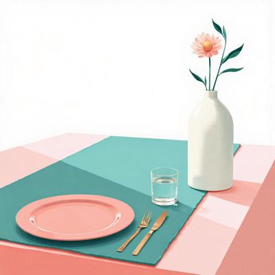 добавь скатерть на стол, под тарелку и приборы [Уточнение для #5843381 'изображена 1 3 стола, на нем лежит тарелка, по бокам нож и вилка, стол упирается в стену ]'