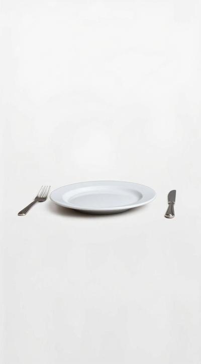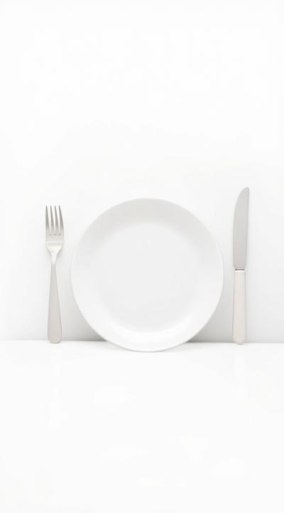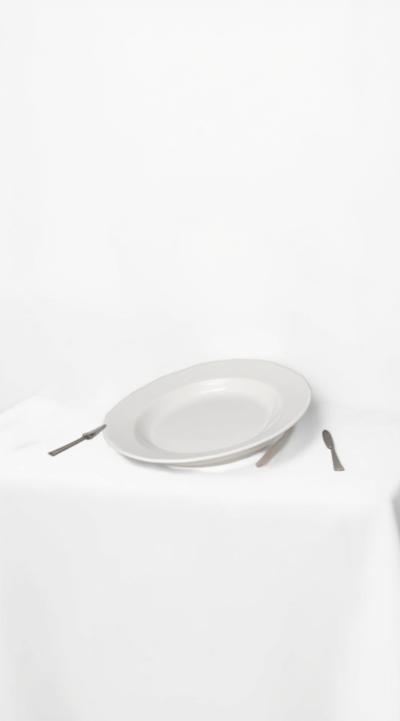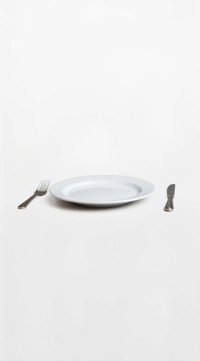убери все объекты кроме тарелки, нож и вилку расположи по обе стороны от тарелки, изображение сделай вертикальным в формате 10:16 [Уточнение для #5843437 'тарелка, вилка и нож лежат на цветной скатерти на столе, стол показан на 1 3, упирается в белую стену в графическом стиле ]'