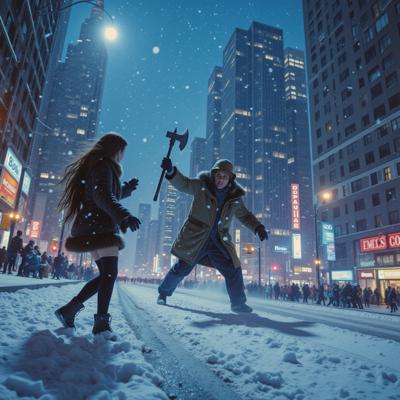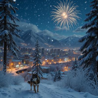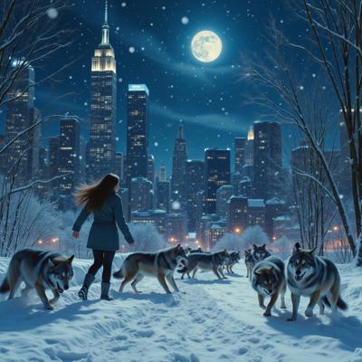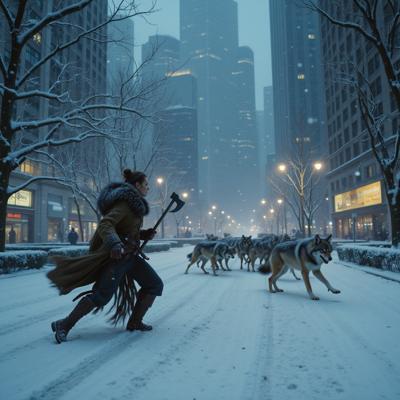 Современный город в новогоднюю ночь, вокруг горы, идет снег, женщина сражается с волками