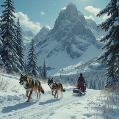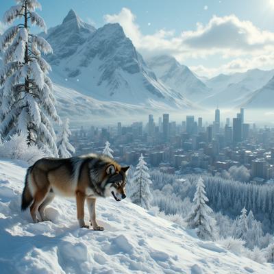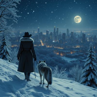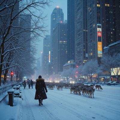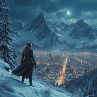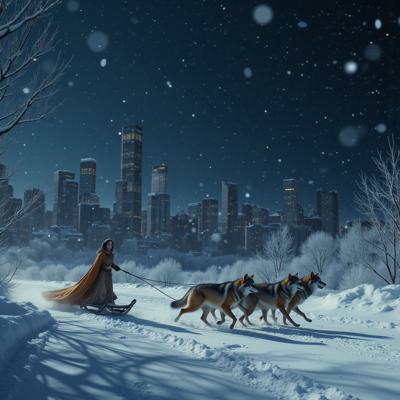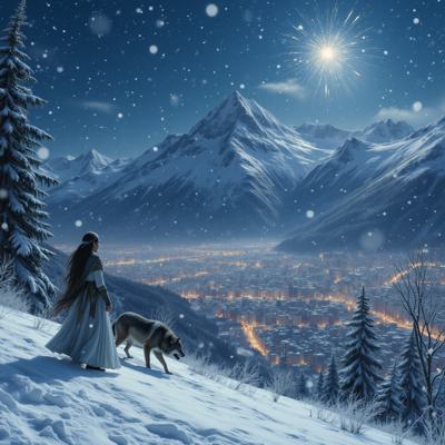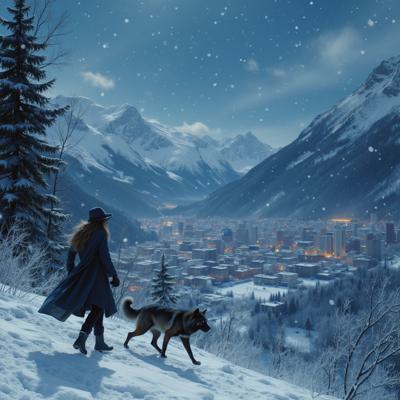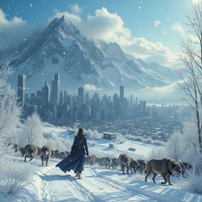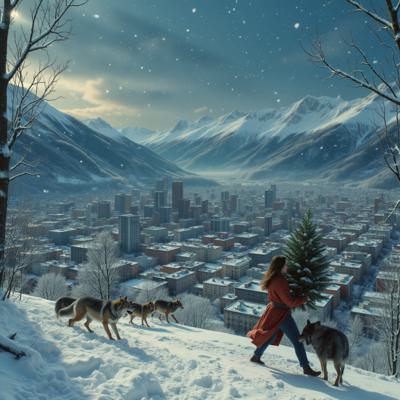 Современный город в новогоднюю ночь, вокруг горы, идет снег, бегают огромные коричневые волки, женщина тянет санки