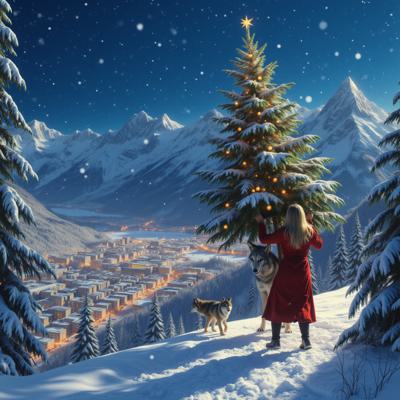 Современный город в новогоднюю ночь, вокруг горы, идет снег, женщина сражается с волками, у женщины в руках елка