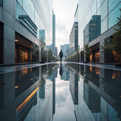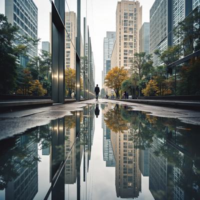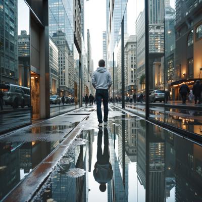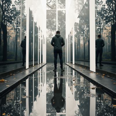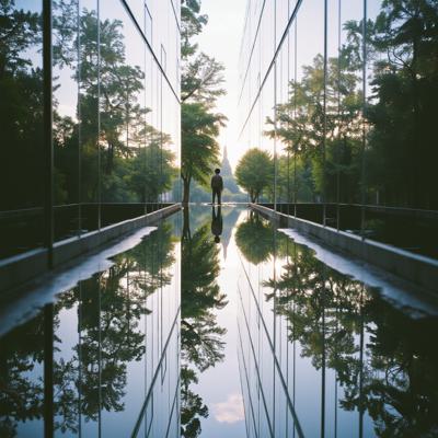 Множество зеркал, в каждом отражается разный участок города или природы, между зеркалами находится человек, он выбирает, куда пойти