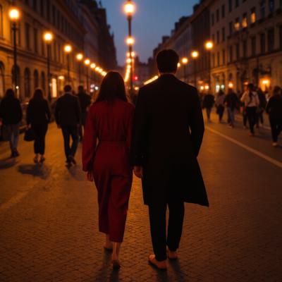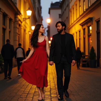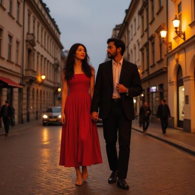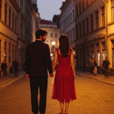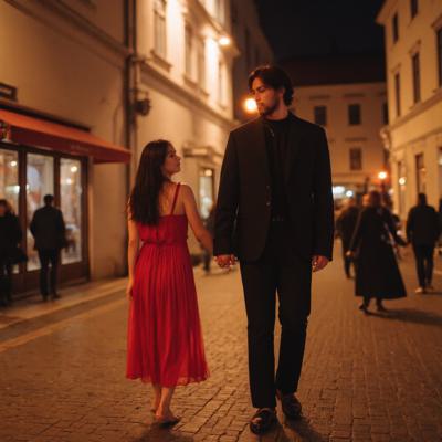 девушка и парень азиатской внешности прогуливаются вечером под теплые лампы города по узким улочкам Праги, держась за руки и смотря друг на друга влюбленными глазами. парень высокий, с темными волосами и легкой бородой, с сигаретой на другой руке. девушка в изумительном красном платье, босиком